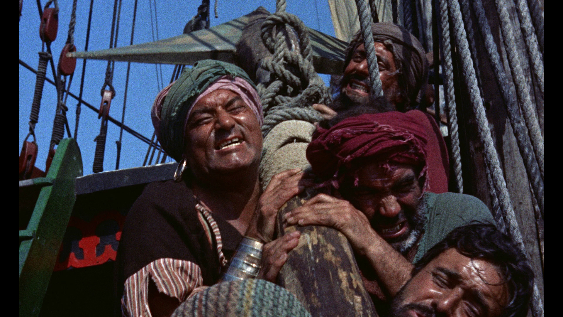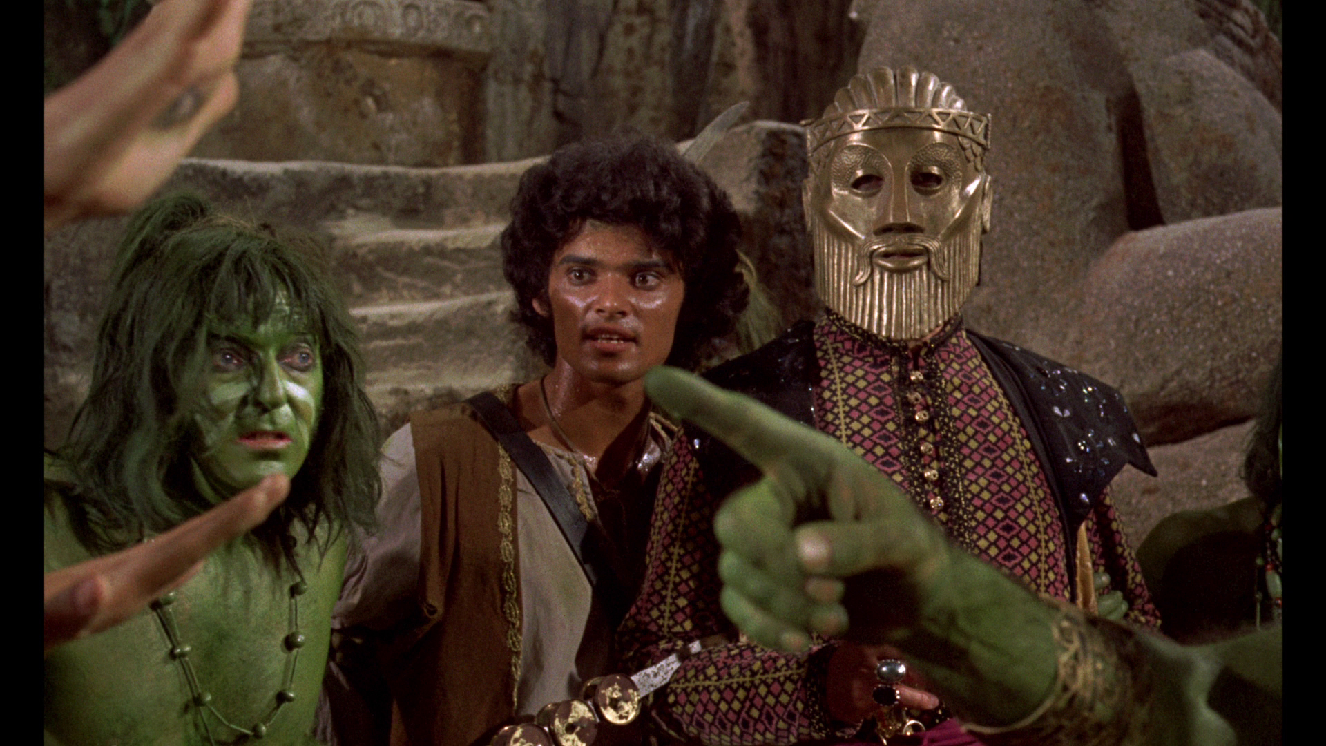 the"This Is Dynamation" featurette, and the theatrical trailer. Again the Indicator expands considerably in the extras department and features a sterling 2K-sourced transfer from Sony, which presents the film in the most immaculate quality possible as long as you take into account that there's more dirt and grit baked into the rear projection stop-motion footage than either of the previous two films. (Note: the first pressing featured a darker, more muted transfer compared to the Twilight Time, reportedly due to a different master delivered, but the more vibrant version is currently available as a repressed disc. Grabs in this review are from the second pressing. Anyone wishing to replace their current Blu-ray disc of SINBAD AND THE EYE OF THE TIGER should contact Powerhouse Films at info@powerhousefilms.co.uk providing proof of purchase and confirming the unique number of their limited set (as given on the rear of the bellband, 'xxxx/6,000').