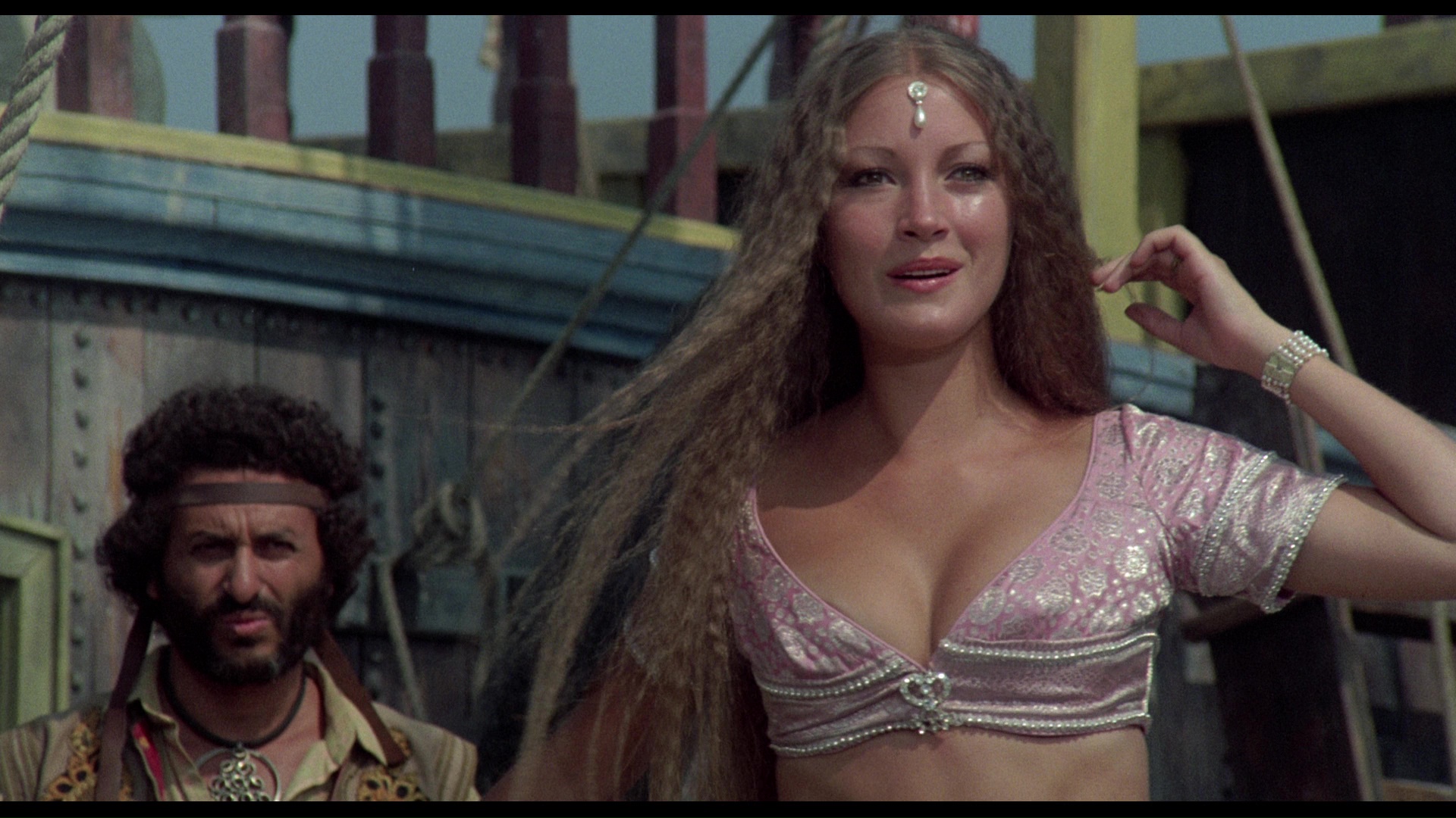 Fifteen years after the release of 7th Voyage, an entire generation of effects artists had been inspired to take Harryhausen's ideas to a new level in both studio and indie films. Harryhausen decided to revisit his most popular hero with a brand-new production, The Golden Voyage of Sinbad, which began the tradition of using a different director, star, and composer for each film in what would become a trilogy. (It also started the unofficial trend of baring as much female skin as possible within the then-lenient confines of a G rating.) John Phillip Law (Barbarella, Danger: Diabolik) grew out a beard and sported an earring as the adventurous sailor, who retrieves a golden ornament from a flying homunculus during an ocean expedition. The discovery's supernatural connections are immediately obvious when Sinbad decides to wear the sparkly gold treasure as a necklace into town and discovers it's tied to a nefarious sorcerer, Prince Koura (Baker, fresh off of Nicholas and Alexandra and The Canterbury Tales and a future Doctor Who based on his role here), who wants it back for his sinister plans. Sinbad and his men end up visiting the island of Isor to see a gold-masked oracle capable of unlocking the mystery, only to be taken prisoner instead and forced into battle with a giant centaur. Also involved is a Vizier (Wilmer) who possesses the other half of the ornament, which is actually a mystical map, and a slave girl named Margiana (legendary scream queen Munro) with an eye tattoo on her palm