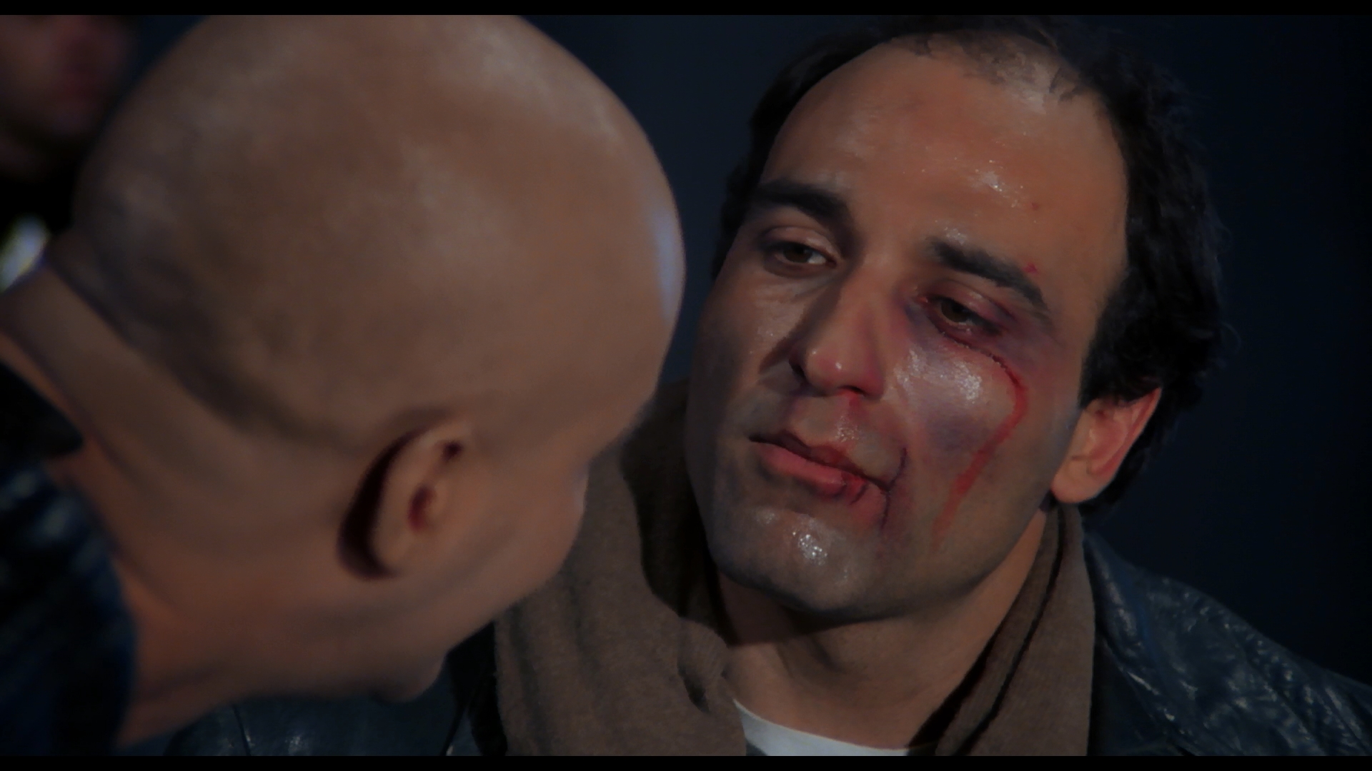 (10m20s), "Future Is Now," speaking in Italian with English subtitles about working with both Sergio and Luciano Martino including learning all of her English dialogue by heart despite the "Babel" feeling on set and working inside the wild futuristic sets. His comments about the film's matte painting of the Twin Towers are especially fascinating and poignant, too. The always colorful Eastman gets a fairly low-key interview for him out of his batch of Code Red featurettes, as "Meet the Apeman" (5m37s) finds him speaking positively of both the finished product and working with Martino even if he was "distant." In "Hook Man" (20m31s), Scalondro gets an extensive opportunity to cover his dramatic career in Rome, the challenges of trying to work with a hook hand and convincingly gouge out someone's eyes, and his motorcycle skills that came in handy during the shoot. Finally, set designer Massimo Anotello Galeng gets his turn in "Welcome to the New Middle Ages" (11m21s) explaining how he aimed to bring a "metaphysic abstraction" to the film by combining futuristic elements with the medieval past. Shortly after the Code Red release the film also hit UK Blu-ray and DVD from 88 Films; that edition is not available for review at this moment for comparison, but it features different interviews with Martino, Galeng, and a joint one with Galeng and Ginacarlo Marin.