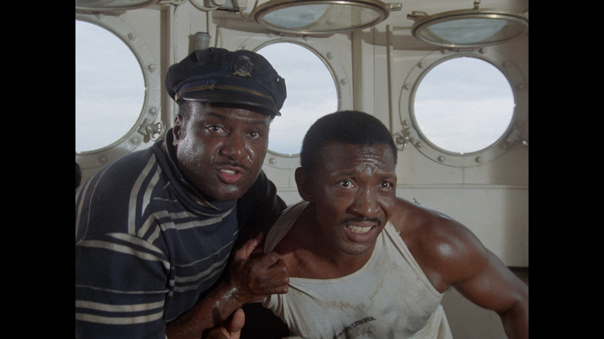 (McKay, a.k.a. Marina Giulia Cavalli, dubbed by the busy and unmistakable Carolyn De Fonseca) have rented a boat to take them to an off-limits island. The two-man crew of the