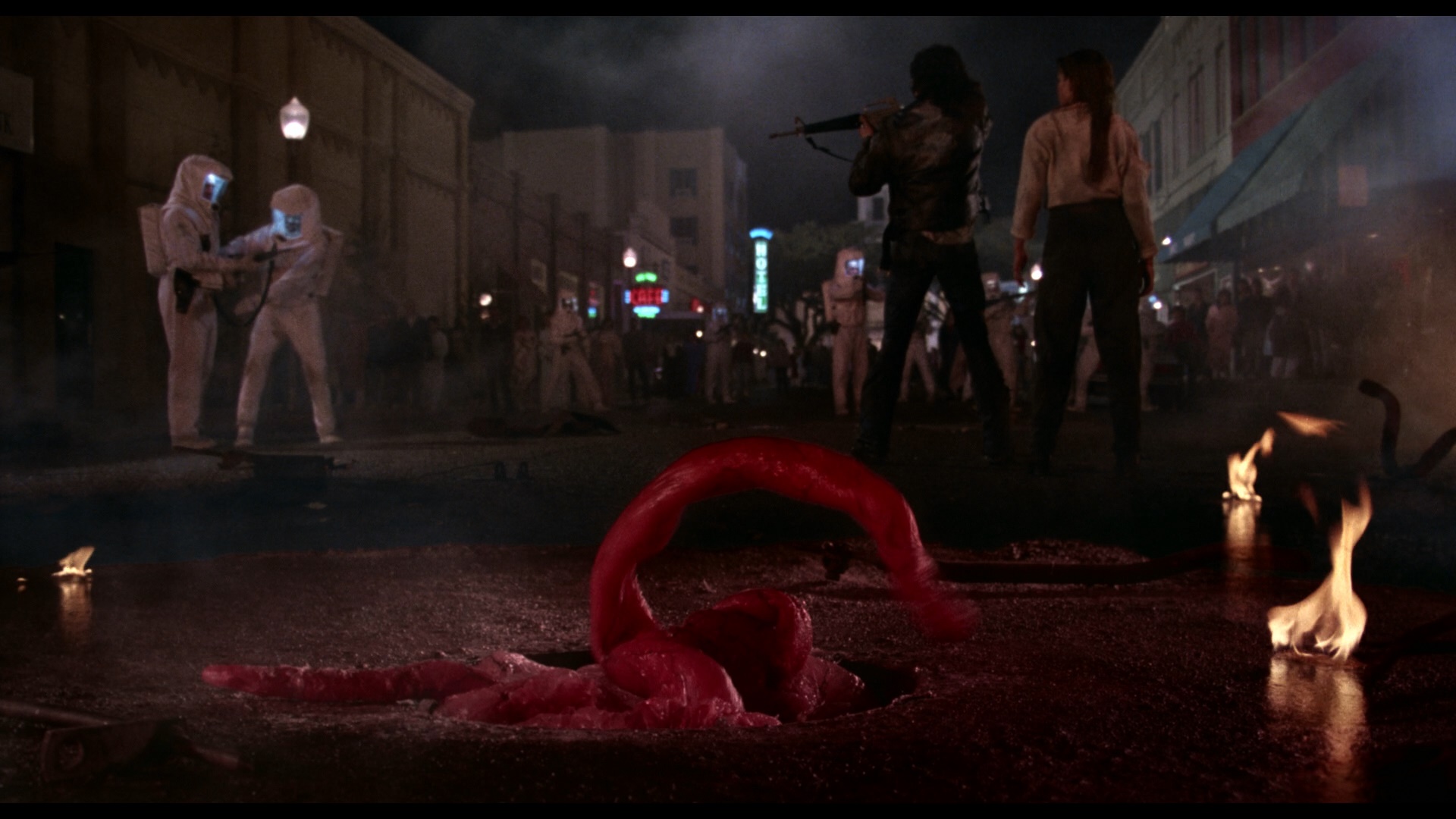 '50s sci-film for an '80s audience, The Blob was part of a fascinating strain of remakes that came in the wake of Phillip Kaufman's Invasion of the Body Snatchers in 1978. The most financially successful of these was David Cronenberg's The Fly, while this one disappointed at the box office like two others, John Carpenter's The Thing and Tobe Hooper's Invaders from Mars. Time has since vindicated all of these films to various degrees (though Hooper's the least, obviously), with this one gaining a lot of traction through cable TV airings and regular video availability. In retrospect it's easy to see why this one had a tough time with audiences in 1988 as it gleefully screws around with audience expectations and violates a number of rules, including a big no-no that didn't set well at all at the time. Fortunately that audaciousness has helped the film in the long run as it still delivers some big shocks and offers a major special effects sequence ever few minutes; if you're looking for a great party movie to spring on people, you've hit paydirt.