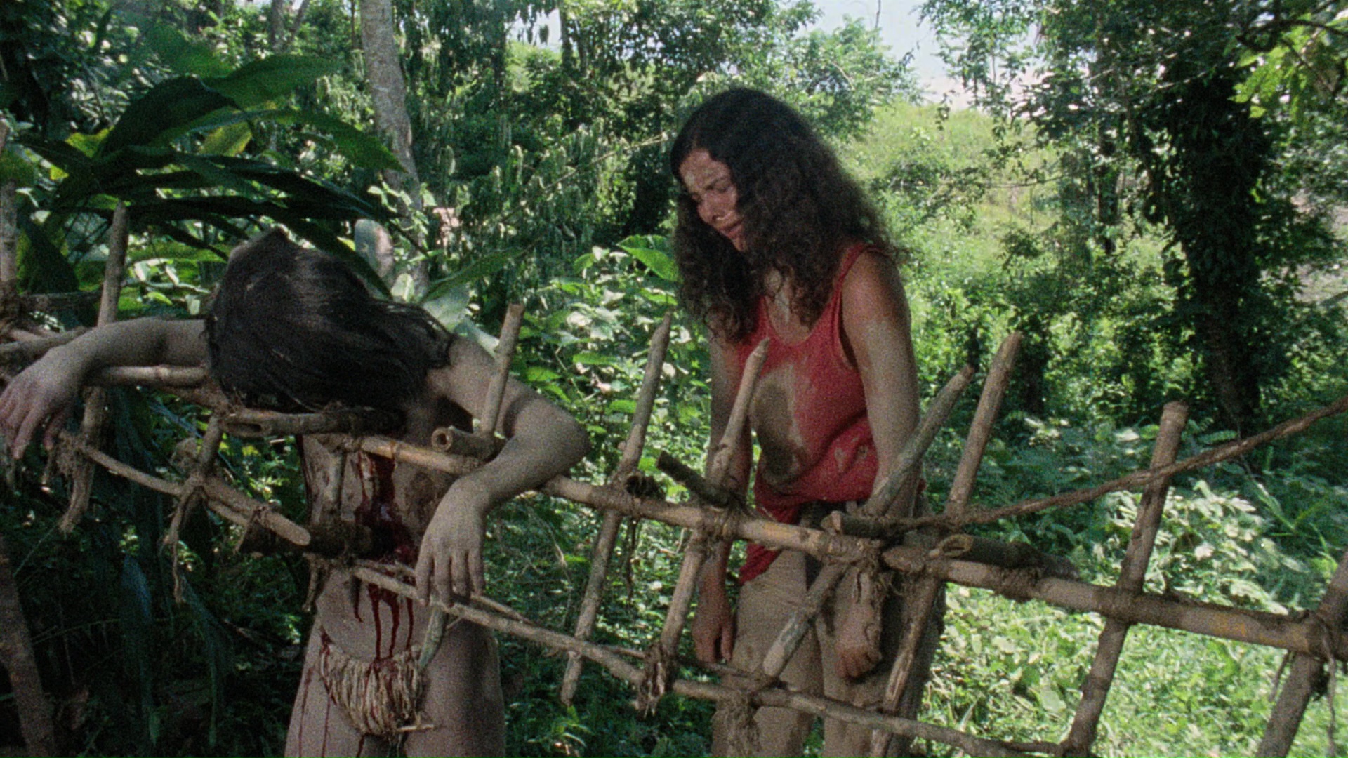 entirely. Touted as being "restored and re-graded from a new 2K scan," it certainly looks different now with a dingier, more yellow appearance, with some slight framing variations throughout and bit more vertical squeezing. It certainly feels a lot sleazier. An LPCM English mono track is offered. Of course, this wouldn't be a worthy release without one of Lenzi's colorful, self-aggrandizing interviews, and here you get one of his very last ones before his death. "A Taste of the Jungle" (21m49s) features the filmmaker in feisty form chatting about his ascension during a hunger for commercial Italian films over arty Antonioni ones, the need to imitation American hits, the glory days of working with actors like Ivan Rassimov, and the international demand for cannibal films that resulted in his most infamous films including one shot "at the crossroads of the drug industry." He also throws some heavy shade at Radice, De Selle, and Kerova for being ashamed of the film and defends his depiction of the natives, plus a hilarious bit about how he found out about the film's success in the U.S.; in short, if you're a fan of the film, this juicy extra will be worth the price tag by itself. (Oh, and of course it ends with the obligatory reference to Quentin Tarantino.) If that weren't enough, you also get "Hell in the Jungle" (33m16s) with Radice, candid as always and now sporting a huge, bushy beard, sharing his unvarnished thoughts on accepting the script for money and not liking his performance ("I just shout all the time"). He isn't a big fan of shooting in the jungle, either, where "even the dolphins are cruel," and there's a reprise of the infamous pig story in all its nasty glory as well as tales of cocaine hunting around the premises. A restoration demonstration (3m30s) shows before and after samples of the work done on the original 16mm negative, which was apparently very green and dark, and a Lenzi photo gallery features a glimpse of him at work on the film. The first limited edition features a numbered sleeve for the hand-finished packaging, with an appropriate vomit bag included for you and your fellow viewers.
