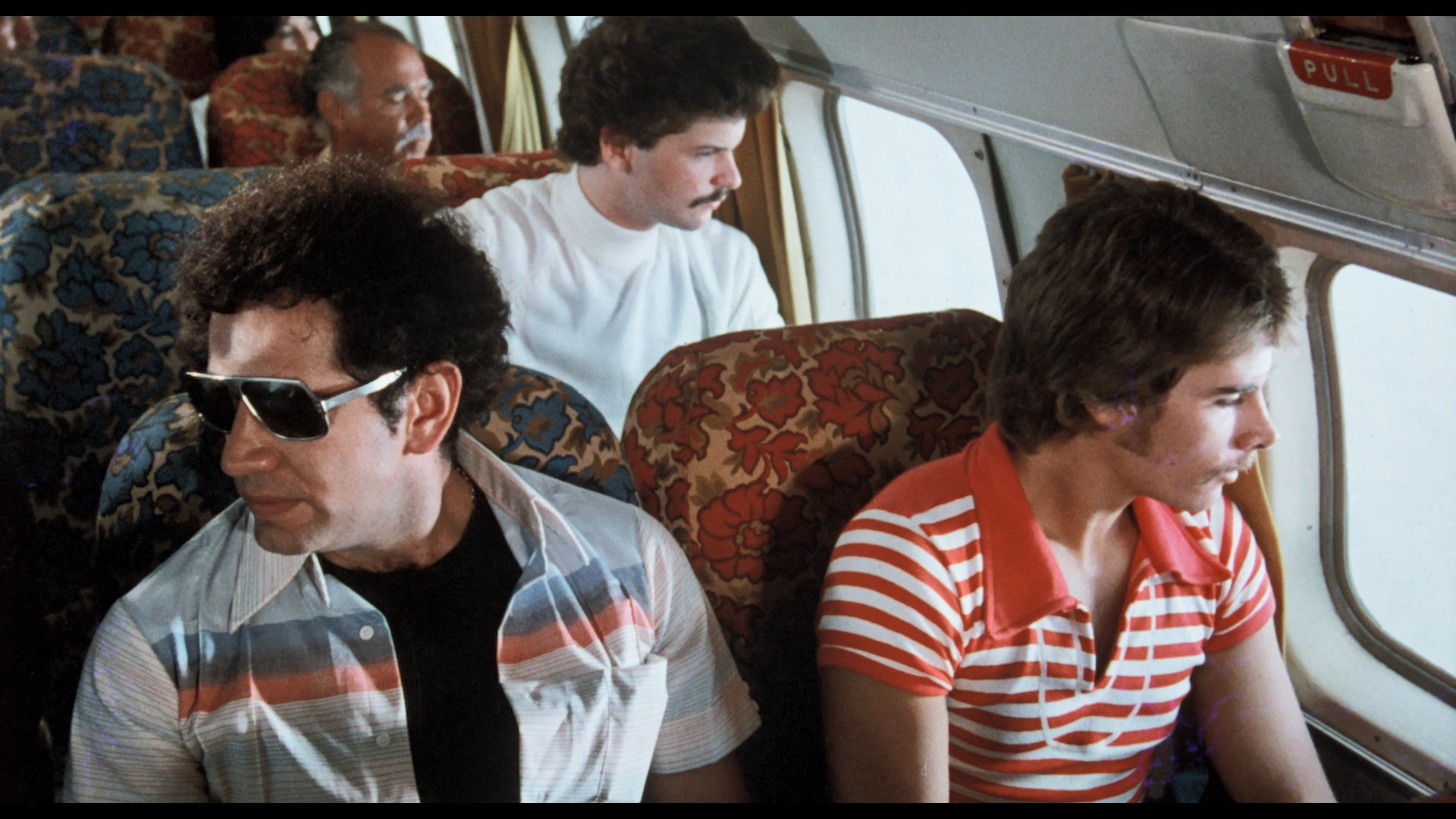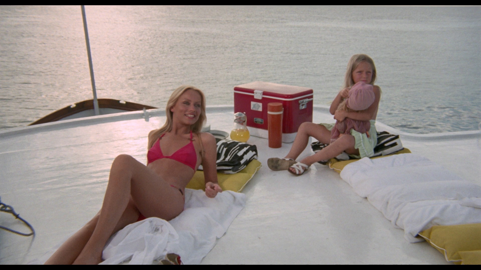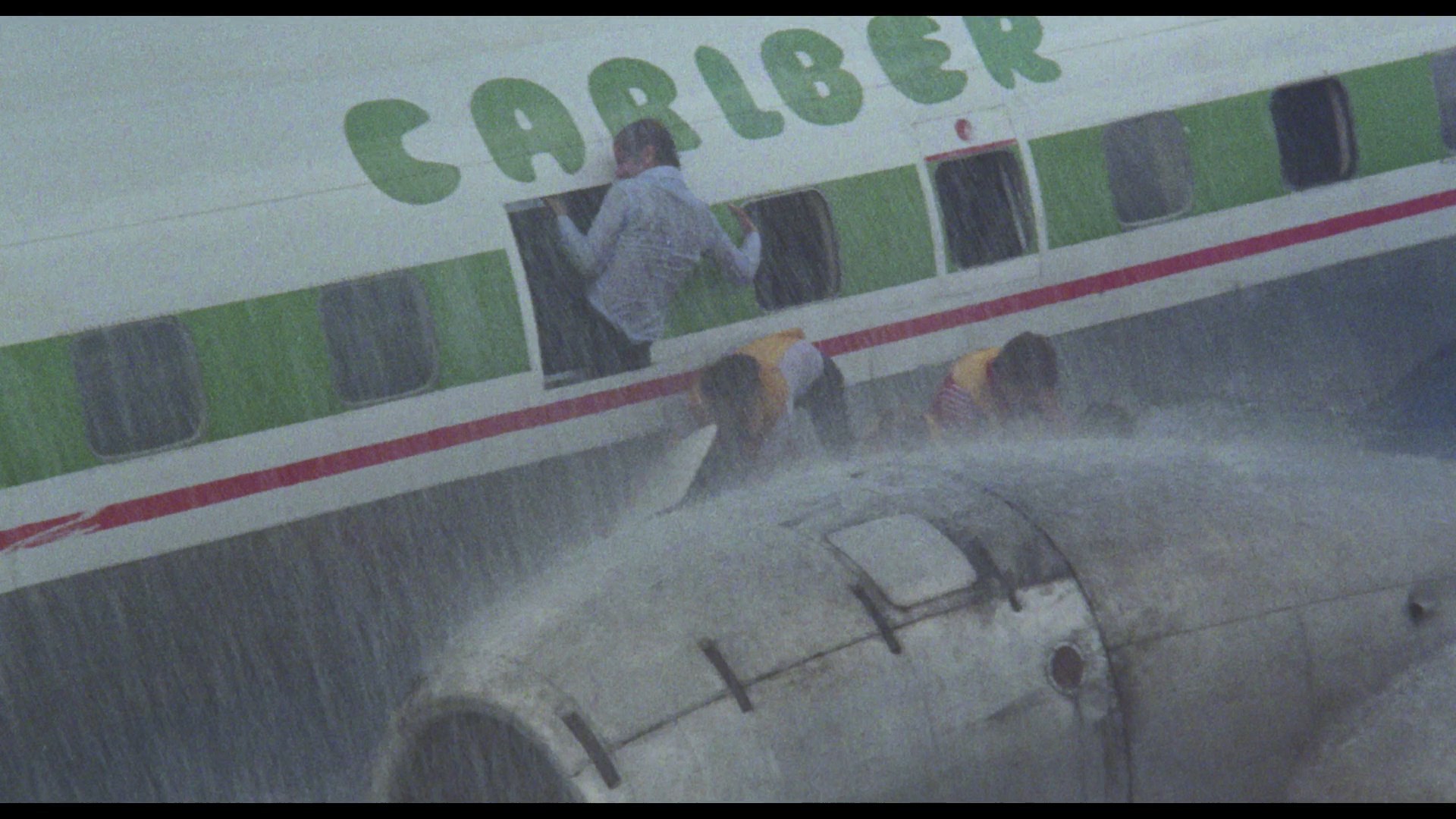 the Damned) and mostly sat around ignored until Synapse Films released it on DVD in 2005 with a colorful widescreen transfer of the standard English version. Extras on that disc include an alternate credit sequence as Terror Storm and bonus trailers including Tintorera, Danger Girls, The Deadly Spawn, and Olga's Girls, all of which should be programmed together for a film festival someday in that exact order. The Vinegar Syndrome Blu-ray marks the first time both the English and Spanish versions have been collected together, the former from a good theatrical print that's brighter and much more detailed than the earlier DVD with more image info visible on the edges. There's some visible element damage on the right side during one reel (see the fifth frame grab comparison below), but otherwise it's in pretty good shape. The Spanish version is another fresh 4K scan from the negative and looks about as good as it could; interestingly, the color processing between the versions is a bit different with reds in particular looking more subdued and natural in the Spanish but more hot and orange-leaning in the English one. The DTS-HD MA 2.0 mono audio is fine for both. In "Surviving the Cyclone" (18m29s), Cardona III returns for another exploration of the making of the film (he acted again in this one, too), explaining how this was made in quick succession after Tintorera and The Bermuda Triangle with an eye on global distribution all the way. He also notes that some different takes were done for the Italian version as well, though that version isn't included here and was reportedly very heavily cut. Then in "The Eye of the Cyclone" (32m36s), Iacono talks some more about being a producer in Mexico after some disastrous releases in Italy, the Lando Buzzanca comedy in Italy that changed the course of his career, the local logistics necessary to pull off the plane sequence, and even working with the Mexican Navy. Finally in "Beware of Sharks" (16m27s), Baker chats over Zoom with Brad Henderson about meeting Cardona, loving the experience in Cozumel, the iffy nature of Mexican stunt work, and her refusal to jump in the water with a shark even if it was "tired!" A gallery (2m39s) of stills and a pressbook is also included. Vinegar Syndrome (Spanish version) (Blu-ray)