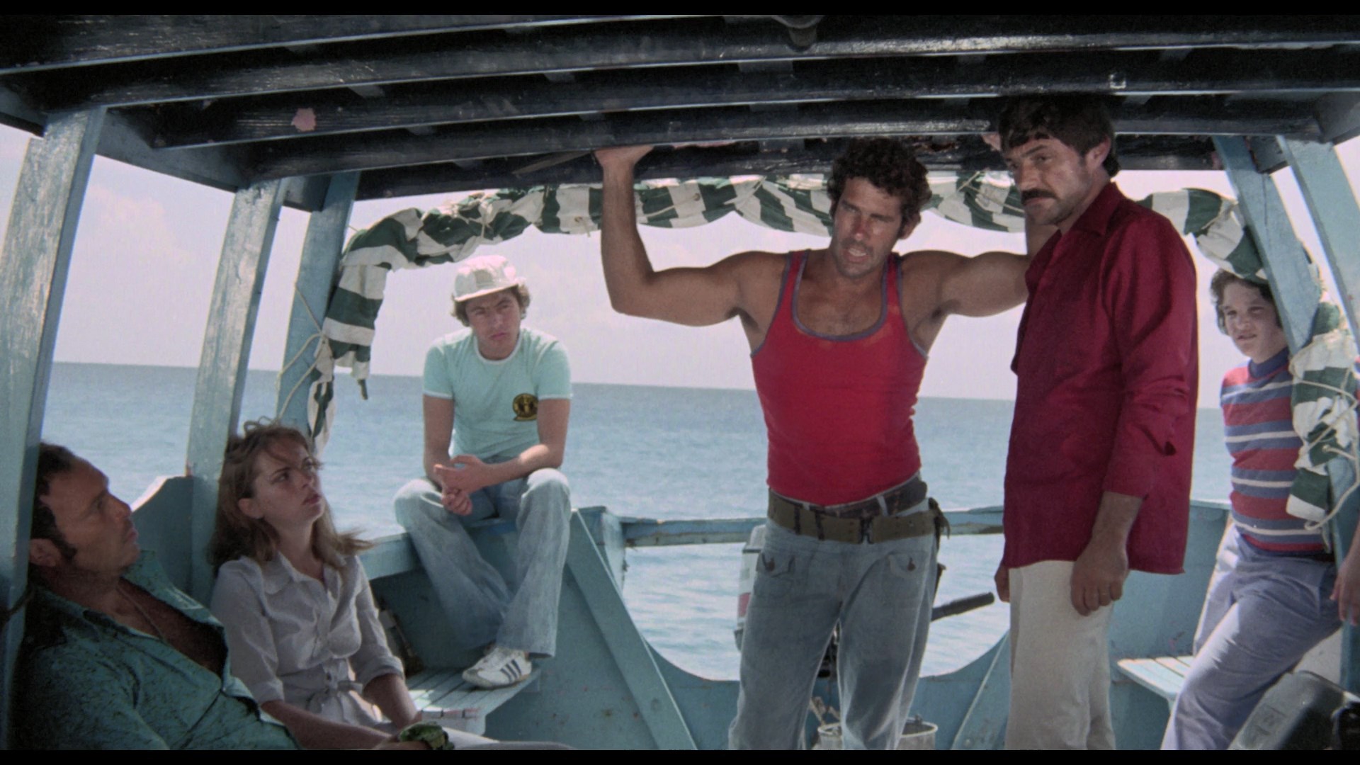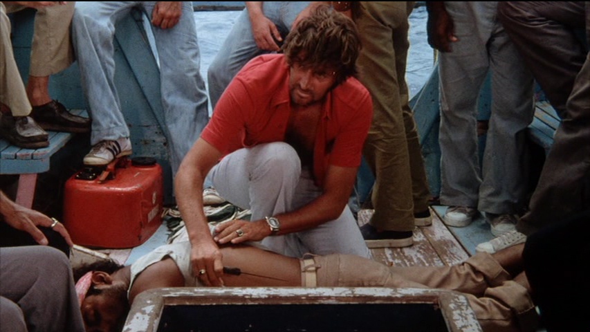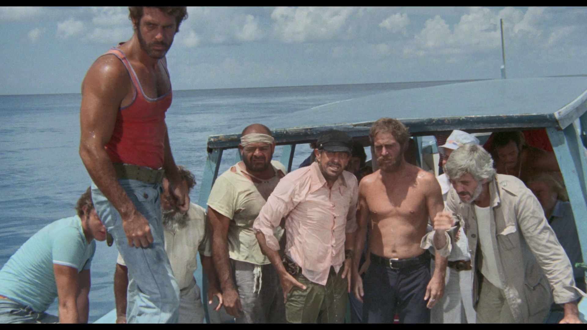 Lionel Stander, who likes to chomp on his pipe and rail against unions. Three guys are also on a small fishing trawler in the area, too, and get word on the radio of a cyclone approaching. As everyone scrambles to get to the nearest islet, the storm hits suddenly with full force, resulting in a plane crash that sends the survivors scrambling onto the Moby-Dick for survival. However, by this point they're all swept far out into the middle of the ocean with only a tiny reserve of drinkable water. As the days stretch on and the wounded go downhill, things take a turn for the worse with cannibalism and a shark attack waiting in store as the officials back on shore, stuck without working phones or telegraph machines, scramble to find them before it's too late.