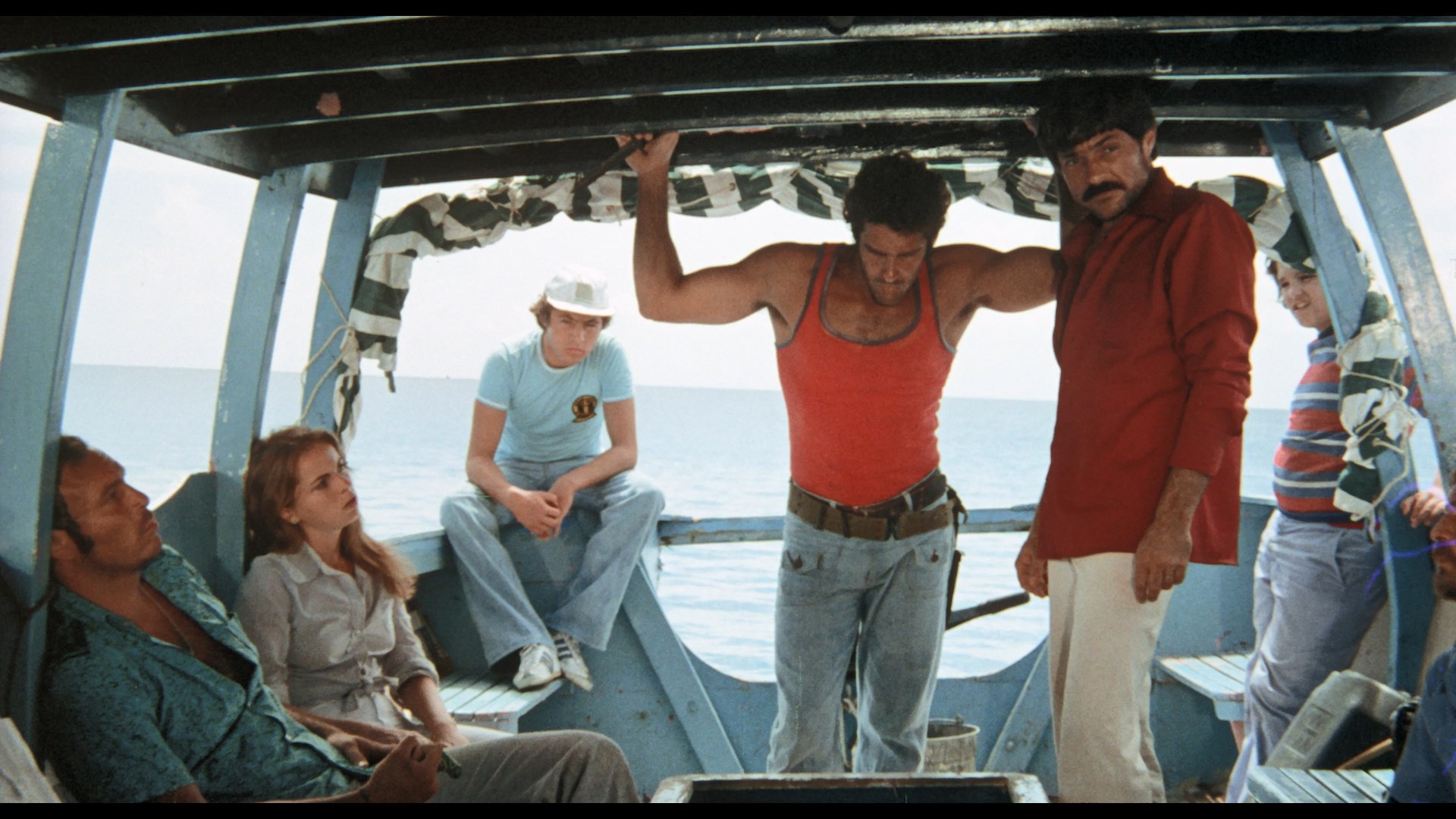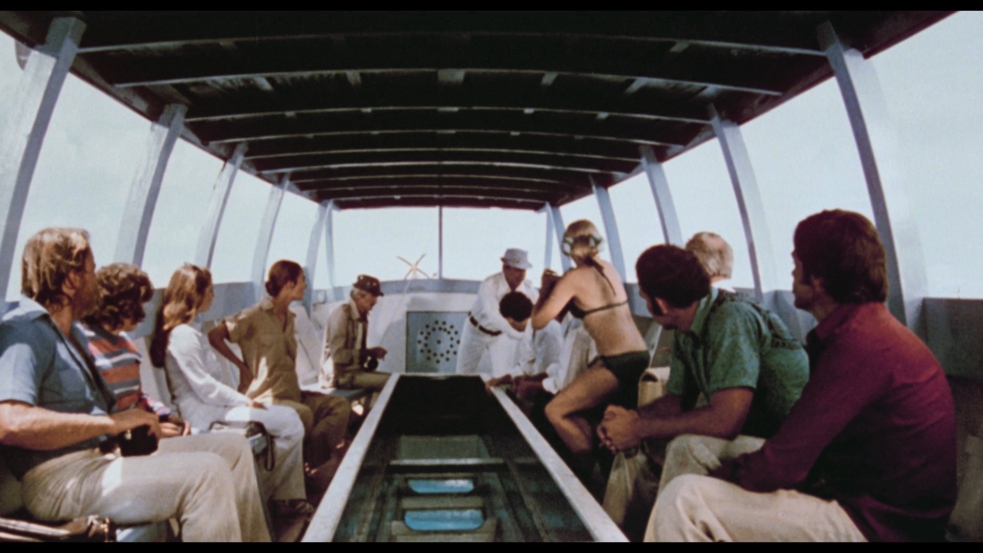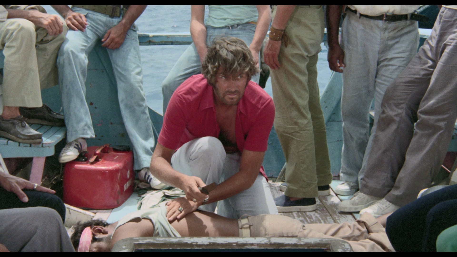 Lionel Stander, who likes to chomp on his pipe and rail against unions. Three guys are also on a small fishing trawler in the area, too, and get word on the radio of a cyclone approaching. As everyone scrambles to get to the nearest islet, the storm hits suddenly with full force, resulting in a plane crash that sends the survivors scrambling onto the Moby-Dick for survival. However, by this point they're all swept far out into the middle of the ocean with only a tiny reserve of drinkable water. As the days stretch on and the wounded go downhill, things take a turn for the worse with cannibalism and a shark attack waiting in store as the officials back on shore, stuck without working phones or telegraph machines, scramble to find them before it's too late.