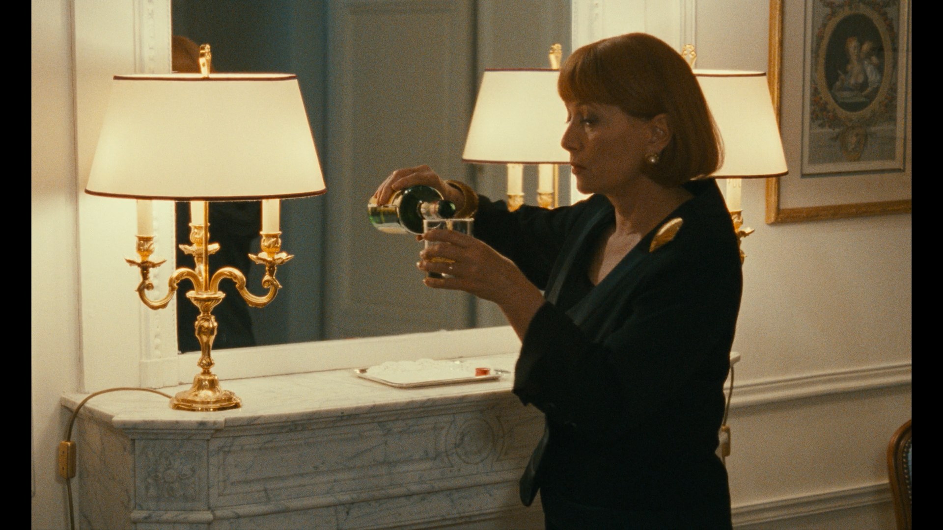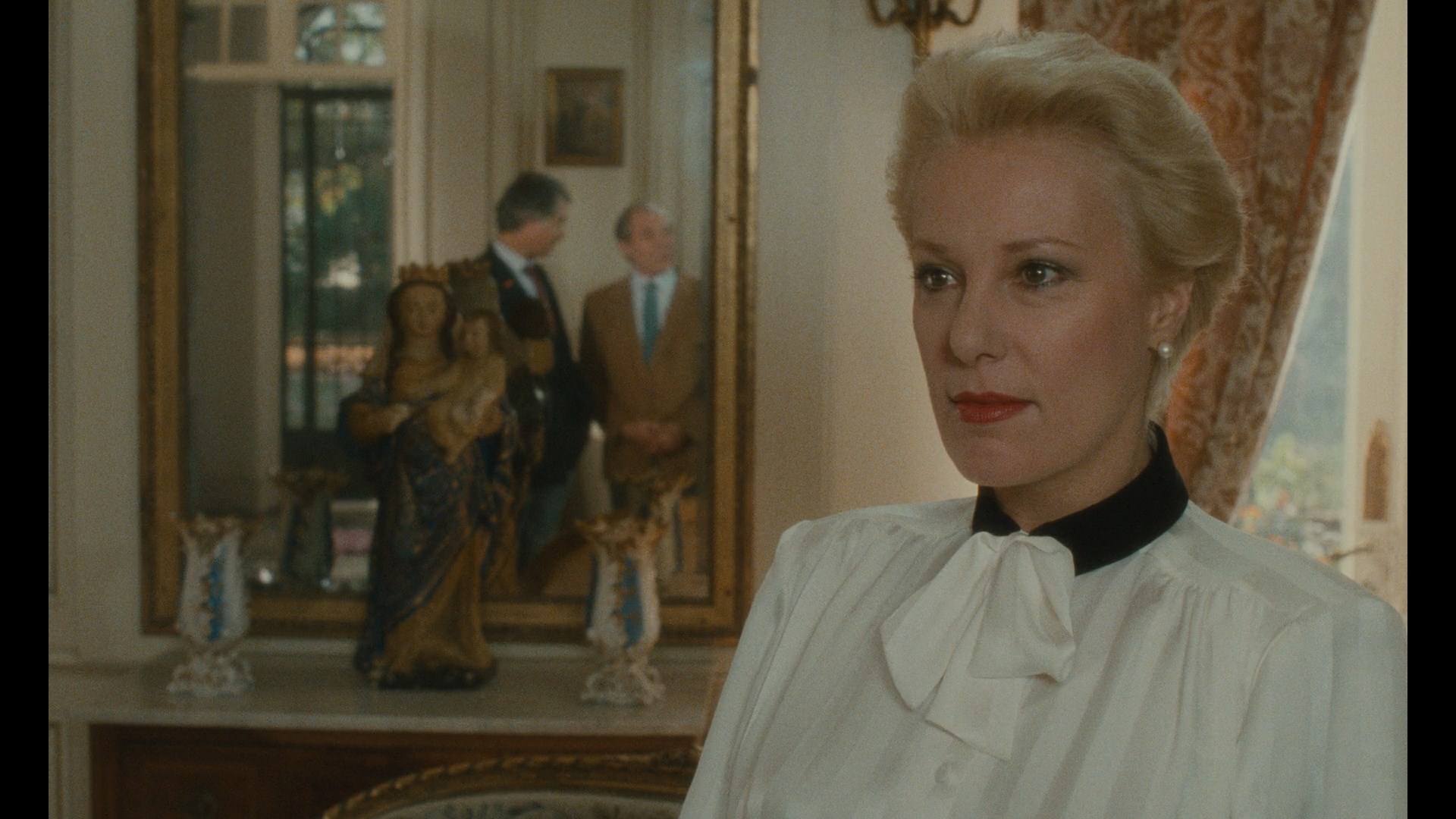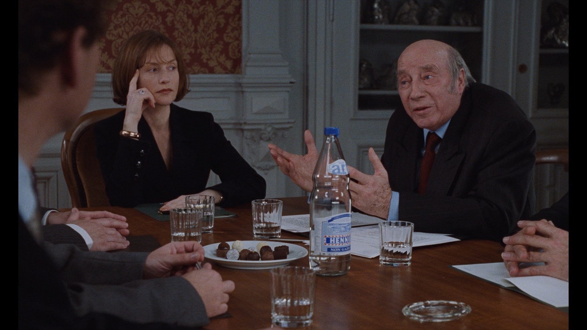 Cérémonie. Released in the U.S. by New Yorker Films both theatrically and on VHS, this eventually went over to Cohen for a pretty nice Blu-ray release in 2016 featuring a Major and Klein commentary, a reissue trailer, and a "Many Forms of Love" interview with Cluzet (42m32s) by New York Film Festival director Kent Jones covering the actor's work with Chabrol. The Arrow Blu-ray is the only one of the second batch to retain the yellow leaning, though it's toned down here relatively speaking and not that bad once your eyes get used to it after a while. Otherwise it looks good with fine detail throughout. A new commentary by Barry Forshaw and Sean Hogan helps put the film in context within Chabrol's career and really goes into the nature of how his tendency to crank out films at a rapid pace hampered his status among the auteur-centric crowd but ultimately may have helped him in the long run. In "Chabrol’s 'Soap Bubble'" (14m36s), Catherine Dousteyssier-Khoze (author of Claude Chabrol: The Aesthetics of Opacity) uses Chabrol's own term for this film (thus the title) as a jumping-off point for analyzing some of his more playful efforts like this and Blue Panther, with an exploration of how production design choices reflect his twisty stories. The Zoom conversation "Film as a Family Affair" (38m11s) features Chabrol's stepdaughter and frequent assistant, Cécile Maistre-Chabrol, chatting about her first exposure to show business through the theater, their working relationship, his pun-loving personality, and his methods on set. Also included are a Magny intro (2m28s) about the film's significance to Chabrol despite its middling box office reception in France, scene specific Chabrol commentaries (24m20s), an EPK-style vintage making-of featurette (8m22s) with the cast and crew, an interview with Huppert (25m38s) conducted by MK2 covering her first meeting with Chabrol and their working process together, the French trailer, and a stills gallery.