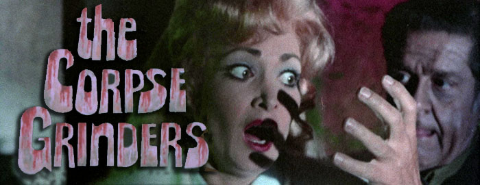 to give the late, great Ted V. Mikels (of epic mustache and castle lady fame) credit for coming up with some of the greatest titles in exploitation history. The Astro-Zombies! Ten Violent Women! Blood Orgy of the She-Devils! Way up among the best of his “gotta see it” titles is one of his longest-running drive-in hits, The Corpse Grinders, which inspired an epic poster art design and far more shot-on-video sequels than any sane human being could ever want to see.