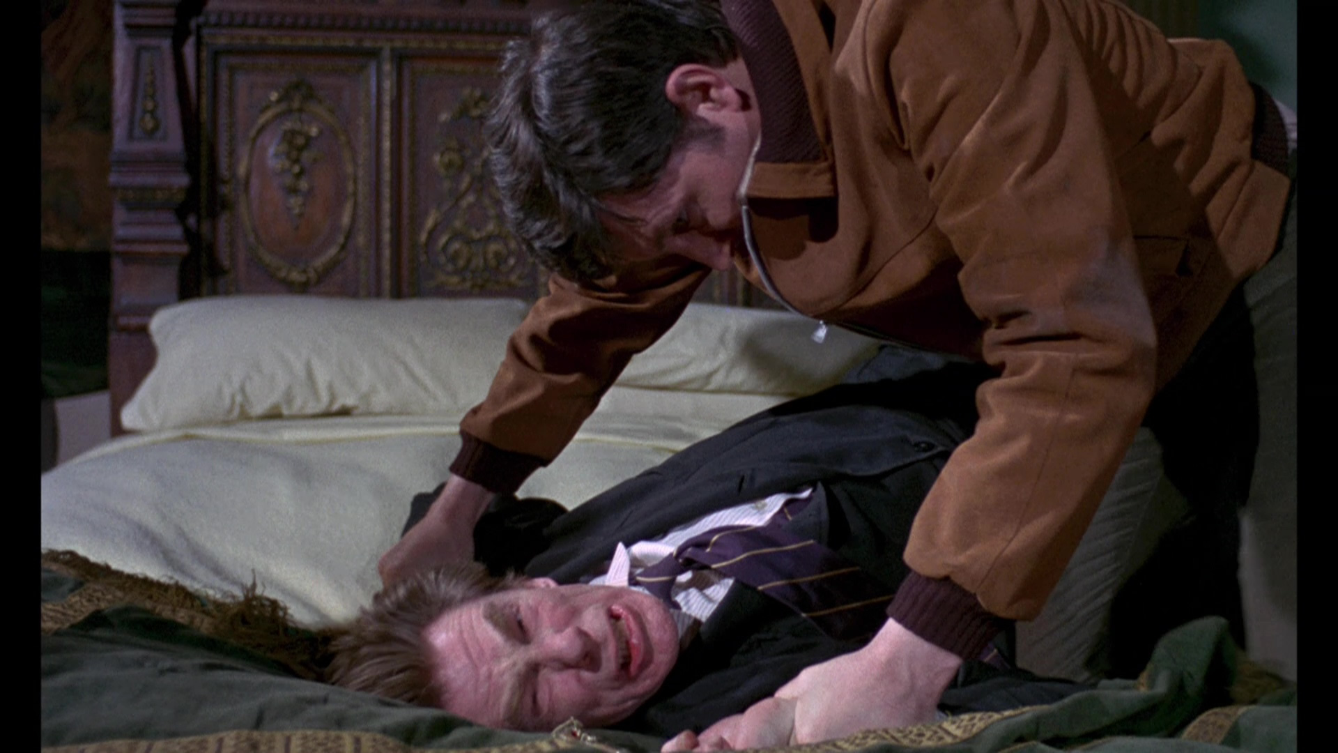 Taken on its own terms, The Crimson Cult is a lot of fun as long as you set aside any hopes of being remotely frightened (apart from the horrifying fashion choices) by this loose adaptation of Lovecraft's "Dreams in the Witch House," later filmed far more faithfully by Stuart Gordon for Masters of Horror. Karloff plays a good guy here, a wheelchair-bound historian on all supernatural matters, and he acquits himself nicely in a dignified role. Lee is given less to do apart from looking mildly sinister and imparting history about the house, while Steele gets about two minutes of screen time and less than ten lines of dialogue; however, that costume is certainly one for the ages. That means it's really up to Eden (a British TV vet) and the ready-to-peel Wetherell (later seen in A Clockwork Orange)