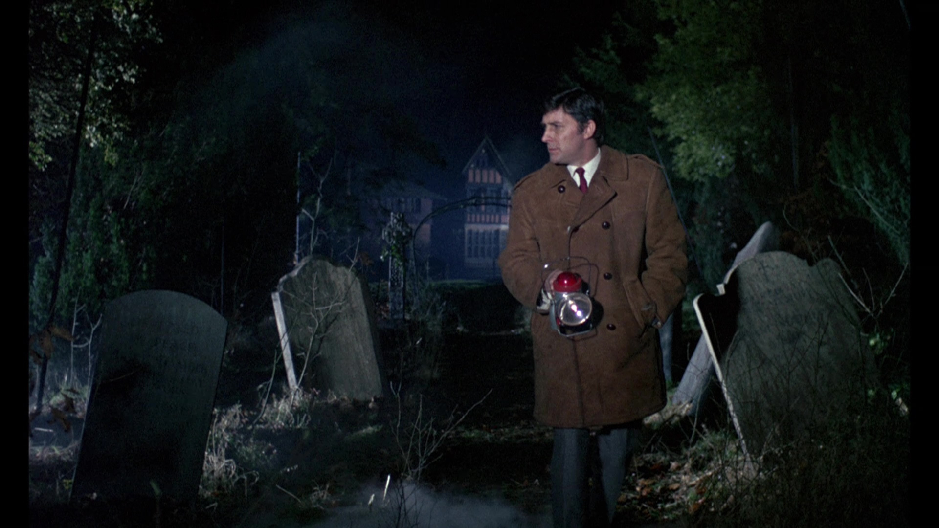 to do the heavy lifting for much of the running time, and while they're competent, they can't compete at all with their more dynamic co-stars. On top of that you get a fun, scenery-chewing turn by great horror character actor Michael Gough, playing a wicked henchman of course. Lending the film a particularly strange air is the fact that it was shot inside a real location instead of sets, in this case the famous Grim's Dyke House in Middlesex once owned by opera legend William S. Gilbert, which is captured with harsh, shadowy lighting and odd angles that alternate between striking and amateurish from scene to scene.