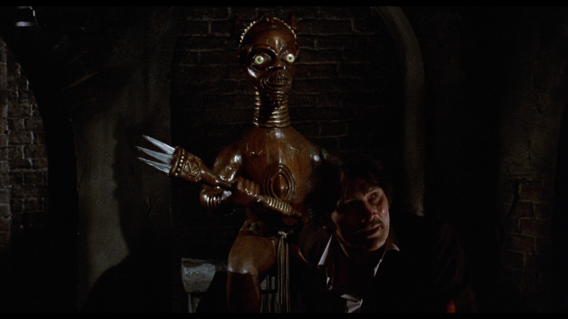another cinematographer who had an eccentric side career as a director, Freddie Francis. Wedged in the middle of a flurry of activity that also included Tales from the Crypt, Son of Dracula, The Ghoul, and Tales That Witness Madness, this is the trashiest of the bunch largely thanks to the participation of producer Herman Cohen (Horrors of the Black Museum). Jack Palance gets to slap on a British accent and go way over the top as antique shop owner and basement cult leader Neal Mottram, who has seized leadership from its founder (a cameo by Powell and Pressburger repertory member Kathleen Byron) and conducts frenzied ritual to the pagan idol Chuku. When he isn't running the shop with his gay partner and possible occasional lover Ronnie (Fellini Satyricon's Potter), Neal goes out recruiting women to sacrifice and rob for the good of the cult while the police led by Sergeant Wall (Jayston) try to figure out the killer's identity.