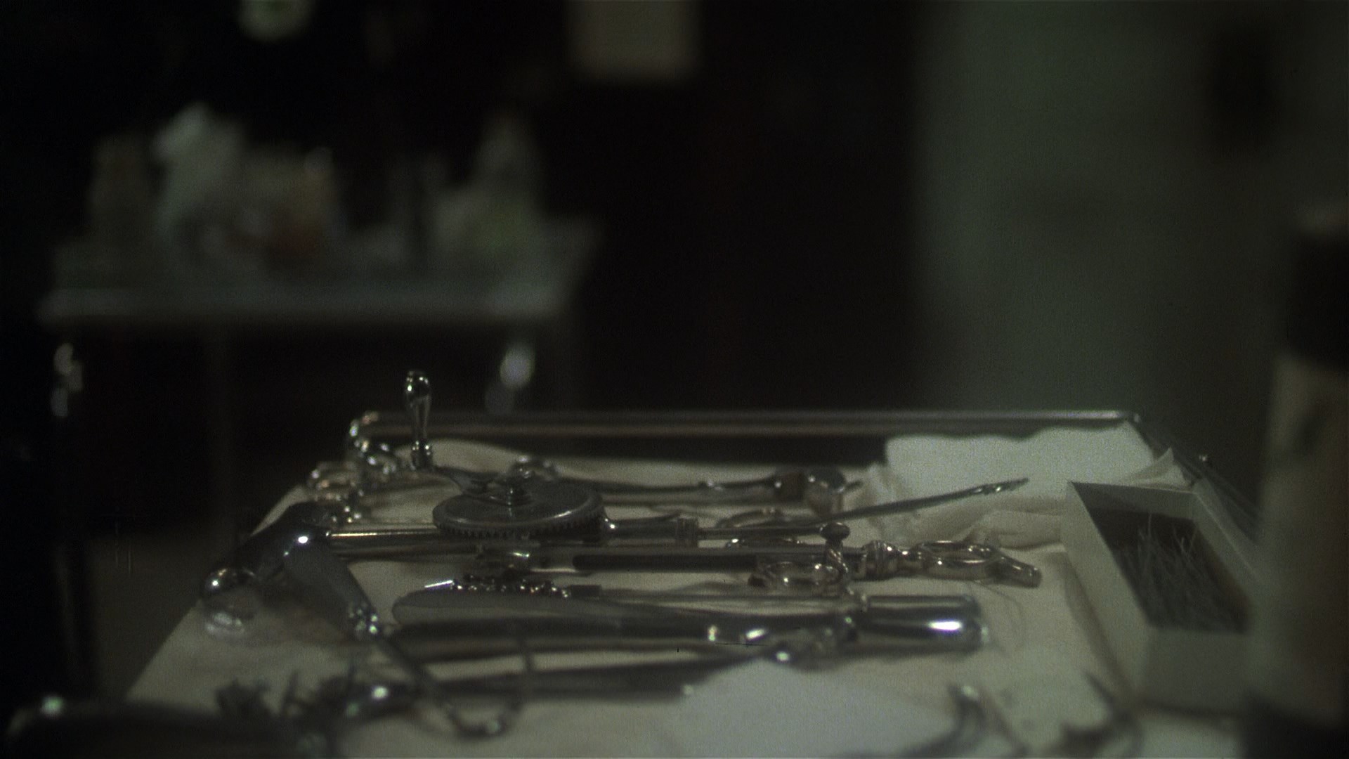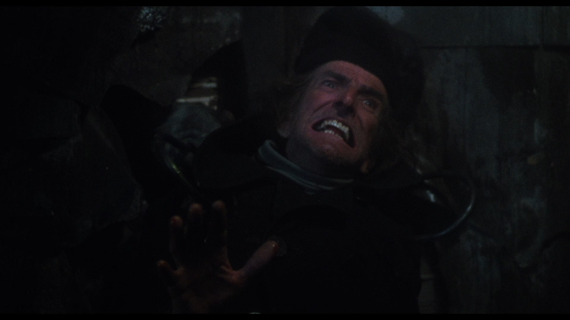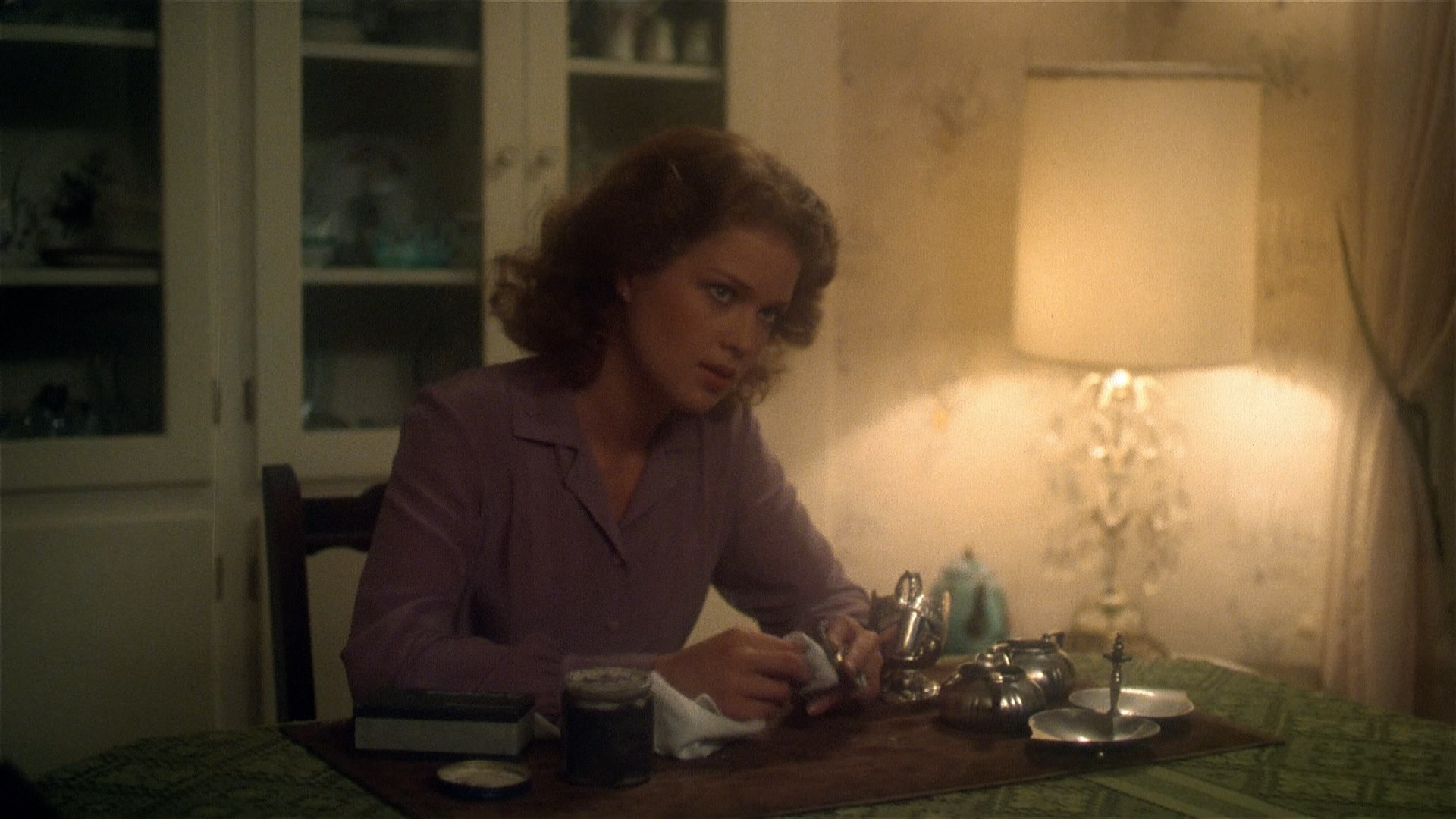 In 2021, Blue Underground finally brought the film to UHD as a three-disc edition (available with three different slipcover designs including a great lenticular version of the needle scene) also containing a remastered Blu-ray and, finally available for the first time ever in any format, Renzetti's magnificent score on CD in its entirety. The new scan is listed as a new 4K 16-bit scan from the 35mm IP, so of course the big question is, how does it look? In a word, spectacular, especially if you're familiar with the challenges posed by this film. The most obvious differences here are more image info visible in the frame and a more balanced color scheme that's less green than before; in motion the grain is also handled wonderfully here with a fine, natural texture that shows just how far technology has come in just over a decade. The UHD sweetens the deal not only with higher resolution over the Blu-ray but with the benefit of Dolby Vision HDR, which brings out even more nuances in the colors and really helps those darker night scenes in particular sing like never before. Just bear in mind that this is a film that makes frequent use of diffusion effects and even filters over the camera in some scenes, and the results here are very satisfying indeed. (Frame grabs in the body of this review are from the 2021 Blu-ray; comparison grabs between the two Blu-rays can be seen at the bottom.) Audio is