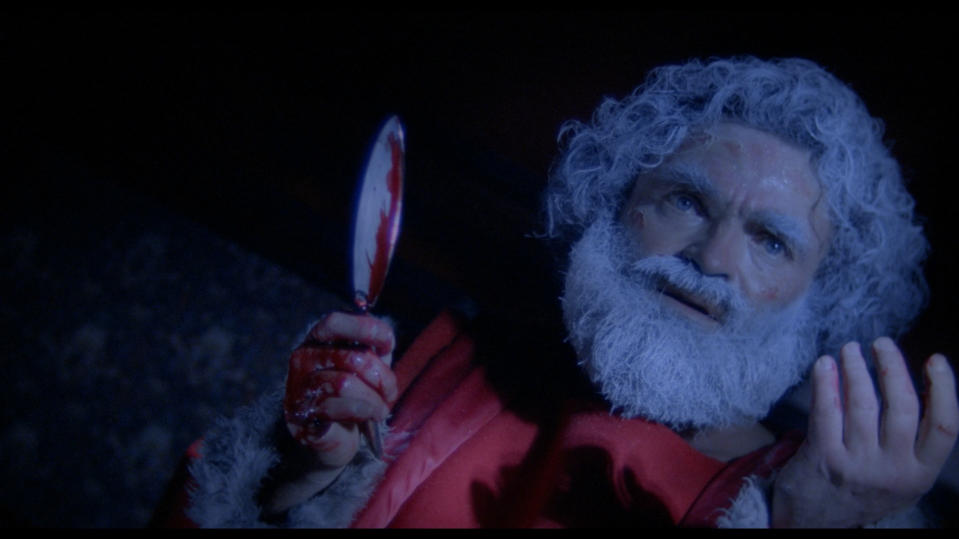 Santa (Diva's Floersheim) is a giggling insane asylum escapee who sets his sights on Thomas on Christmas Eve, just when mom's away and unable to be reached. Poor Thomas has been left in charge of his pretty hip invalid grandfather (Ducreux), but that's the least of his responsibilities when the evil fake Santa comes calling. That sets off a lengthy test of wits between Tommy and the intruder, which turns the entire, enormous house into a bloody battleground.