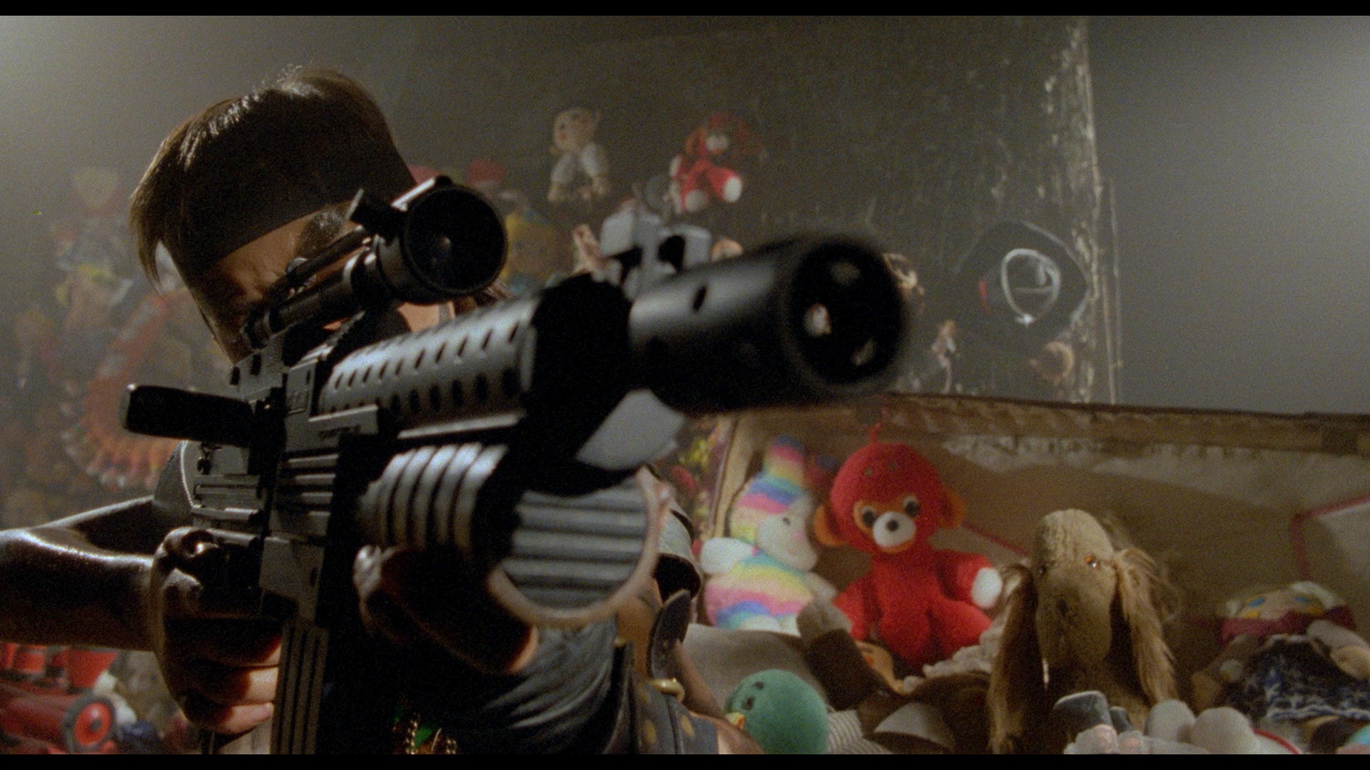 The second disc, a DVD (which is Region 2 versus the region-free Blu-ray), features the same contents in standard definition. The third disc is an extra PAL DVD of separate bonus material, starting off with the new feature-length documentary, "Jouets Interdits" (85m8s), with Manzor looking back at how the film came about during a drought on genre cinema in France, the dedication to his "film father" Alain Delon, the miniatures needed for the ambitious 360-degree shots, and the one scene he hates and wishes he could cut. "To Become a Man" (39m10s) with Musy focuses on how he ended up being cast in the lead of his father's film (after appearing in his previous film with Delon, The Passage) and his thoughts on the war obsession of the character he played, as well as the inspiration for the script when he personally stopped believing in Santa. A vintage interview with a young Musy on the set (8m49s), along with Floersheim and production designer Eric Moulard, offers a different perspective as the young boy chats about watching Delon; some interesting VHS-shot footage from the shoot is included as well. Also included are a storyboard-to-scene comparison (6m35s), a music video for the "Merry Christmas" theme song by Bonnie Tyler(!), and "Pre-Trailer Model Shots" (2m41s) showing narrated footage of the swirling camera shot through the model. Some of the extras were produced in collaboration with