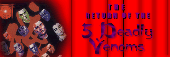 The DVD presentation of Return of the 5 Deadly Venons, packaged and distributed by Crash Cinema, looks better than the earlier VHS release from the same company but will obviously never be demo material. The opening credits have been replaced by a simple title card for some reason, and some scratchs and scuffs appear throughout but never enough to mar enjoyment of the film. The scope framing looks too tight but is far more watchable than the blurry full frame versions familiar from TV showings, and the dubbed audio is, well, passable, given the source. The outrageous fight scenes really carry this film, and this DVD renders them about as well as could be expected. How can you not love a film with black metal hands that pop out and shoot deadly darts at their opponents? Not for all tastes, obviously, but if you want to venture beyond Bruce Lee, this is a good place to start.