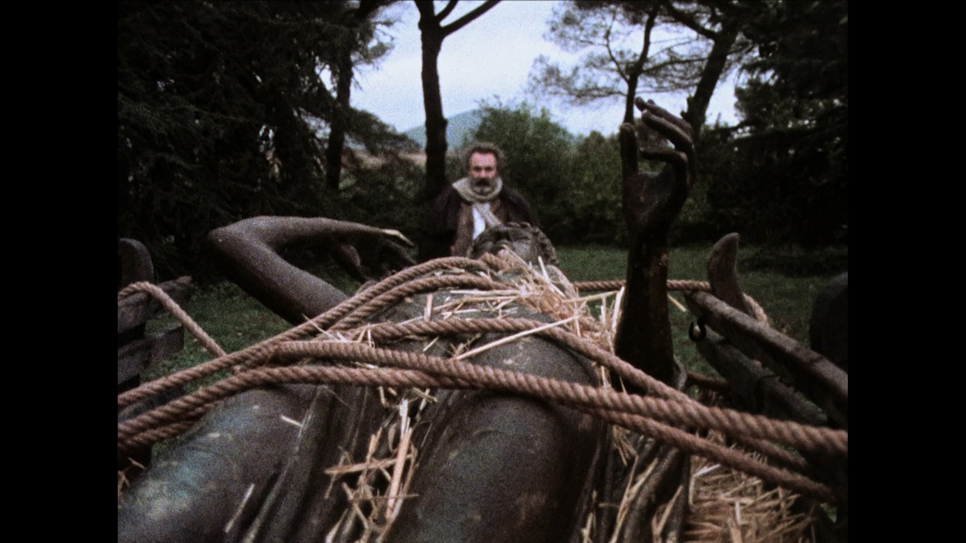 Next is the big draw of the set, "La Venere d'Ille" ("The Venus of Ille") (63m26s), co-directed by Mario Bava and Lamberto Bava just after the release of the latter's official debut feature, Macabre. Based on a story by Prosper Mérimée, it involves an antiquities specialist, Matthew (The Psychic's Marc Porel), summoned to the estate of the wealthy Mr. de Peyrehorade (Fausto Di Bella) to assess an artifact found on his grounds: a striking statue of the goddess Venus. Rumors of a curse surround the statue with children daring each other to touch it, and meanwhile the son of the manor, Alphonse, is engaged to marry Clara (Daria Nicolodi, fresh off Bava's Shock and star of a prior RAI chilling classic, 1975's Ritratto di donna velata), who reminds Matthew of the uncanny statue when he tries to draw it. When Alphonse temporarily places his wedding ring on the statue, the stage is set for the artifact to reveal its true nature. Rightly regarded as the series' finest achievement, this is an elegant and haunting chamber piece that serves as a suitable swan song for its beloved creator as well as a solid contribution from his son. This is the only episode that still exists on film thanks to a recently discovered 16mm print, and it looks the best of the lot with a fine HD scan bringing out a lot more detail than we've had before. Video Watchdog's Tim Lucas provides another excellent audio commentary laying out the production of the film (which was shot in 1979, with the series belatedly airing in 1981 well after Bava Sr.'s death). He also offers comparisons to the source story and has plenty to say about the collaborative process between its two directors. In "Venus in Love" (21m14s), Lamberto Bava looks back at the film, his only RAI project, including thoughts on what he directed versus how his father might have approached it. He also explains how the very short original story had to be expanded with other elements to bring it up to its current length while maintaining the spirit of the author. Finally in "Nemo Propheta in Patria" (12m56s), cinematographer Nino Celeste chats about the process of working with two directors with very different degrees of experience, as well as the creative choices made to create the right mood for the production.
