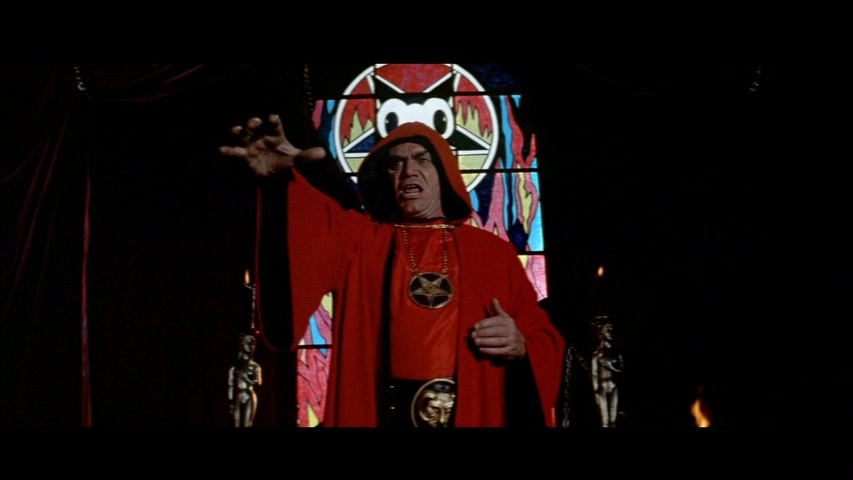 After suffering for years in horrendous pan-and-scan prints, The Devil's Rain first got the widescreen treatment courtesy of VCI in 2001 in a nice-looking but non-anamorphic DVD, cropped a bit in its framing to about 1.95:1. The evocative scope photography (in Todd-AO - how often do you see that on a horror movie?) makes excellent use of shadows and weird The Devil's Rainspatial compositions, though most general circulating prints were chopped off to 1.85:1. The VCI disc also includes a brief photo gallery and a tacky U.S. video trailer that spoils the entire story. The Devil's RainDark Sky's 2006 anamorphic upgrade restores the entire 2.35:1 framing and looks more vivid, thanks to being sourced from a more recent hi-def transfer. Color and detail level look improved throughout, though some of the artistic choices get pretty odd with more clarity; for example, Lupino's backseat car attack on Prather would have been quite frightening except that it takes place in broad daylight, where every flaw in her make-up stands out like a sore thumb. The extras are easily worth the spin as well, kicking off with Robert Fuest's lively commentary track. He discusses most of his career from his early production design days through his most famous titles, discussing the actors along the way and even debunking Cinefantastique's claim that he suffered a breakdown after shooting this film. Also included is the unforgettable theatrical trailer (much better than that VCI one) that includes some great '70s paintings, three radio spots, and a brief (34-second) B&W newsreel clip of LaVey in action.