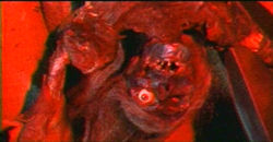 Previous VHS editions of Evil Spawn have looked like total garbage, so at least the Retromedia disc is a step up to watchable. The variety of film stocks and limited technical resources cripple the ambitious color design, which features some surprisingly vivid bits of expressionistic lighting, but the wider framing allows additional information on the sides, making this at least an acceptable presentation. The disc includes another Nite Owl Theater romp with Fred Olen Ray, complete with naked girls cavorting through the set; the extra materials include longer outtakes of the Carradine footage and some production photographs of the original monster design, which was jettisoned when Ray turned over the reins on the project. Also included for posterity is the bizarre theatrical trailer, which tries to pass this off as a Carradine sci-fi film.