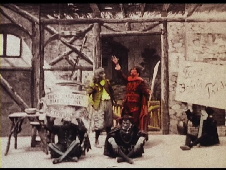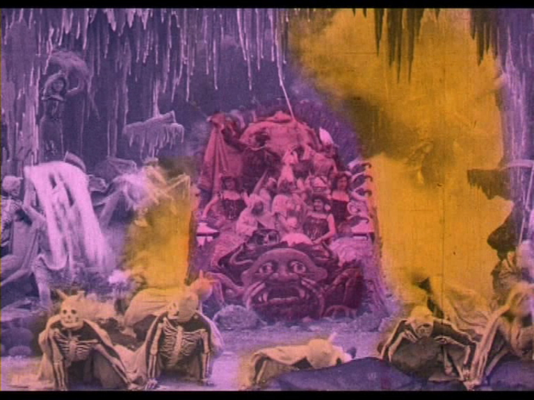 est: "Les sept châteaux du diable" ("The Devil's Seven Castles"), an 11-minute rendition of "Faust" with the devil dragging the hero down to the River Styx. It's a gothic, impressive piece of artistry whose aesthetic is elaborated upon in another short, a 1902 version of "Ali Baba and the Forty Thieves" complete with wild painted tableaux, posing women, and Arabian-inspired dancing.