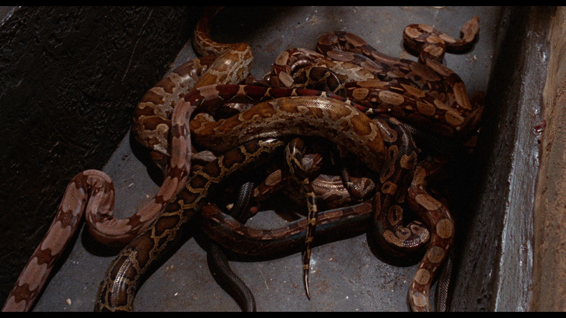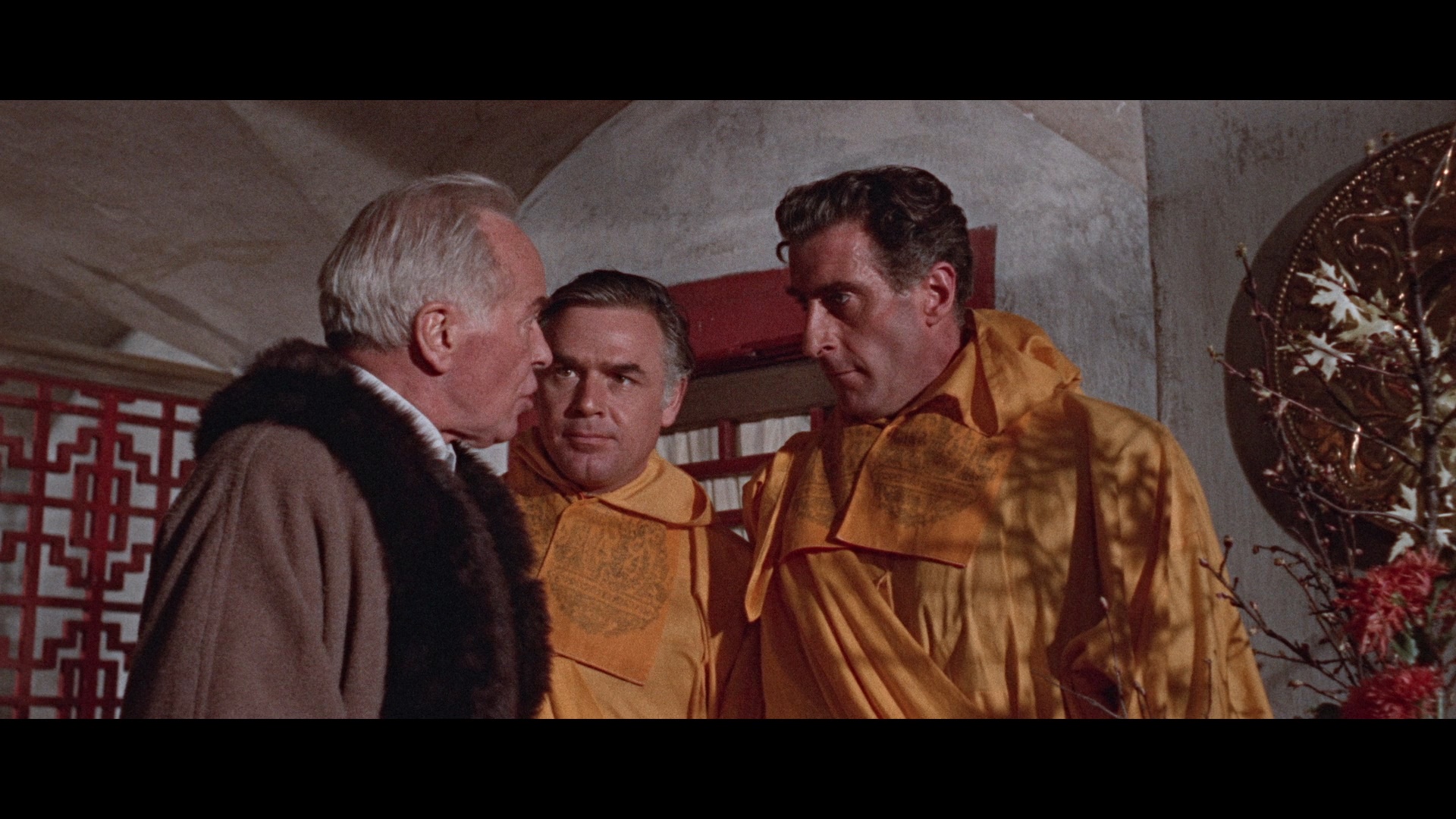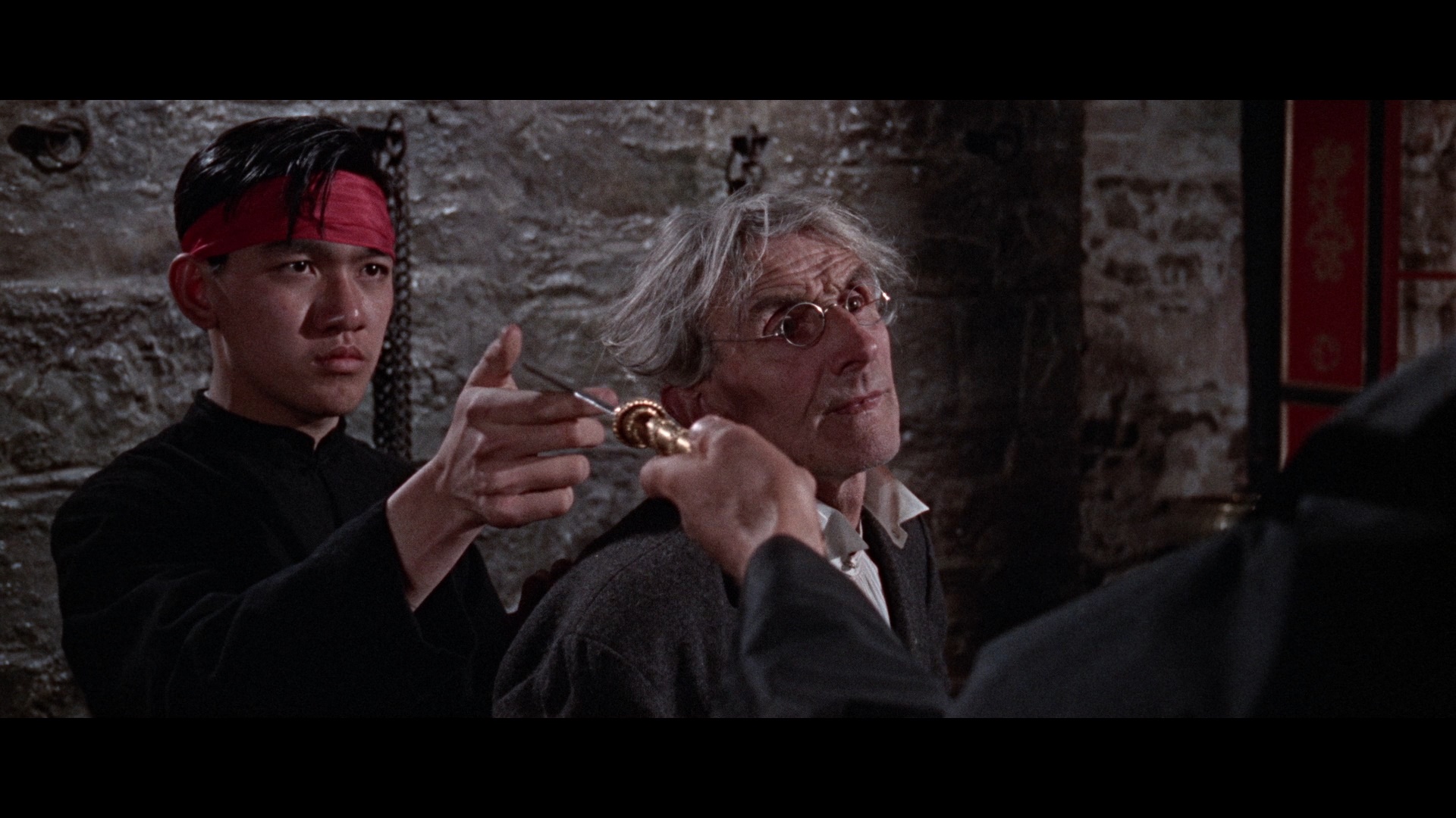The Indicator edition is a real godsend, marking the film's global debut on Blu-ray and featuring an impressive 4K restoration from the original negative. You actually get two viewing options here, the standard theatrical framing throughout and, as discovered during the restoration process, a full aperture version of the third reel, which was damaged on the left side before the film's release and was zoomed in on all theatrical prints and prior video transfer to compensate. It's a nice option to have, and if you don't mind the The Face of Fu Manchuthin white scratches fluttering against the edge of the left side, it's nice to see the extra image info that had always been hidden before for such a significant chunk of the running time. The DTS-HD MA English 1.0 mono track also sounds excellent and comes with optional English SDH subtitles, a configuration repeated for the other four films in the box. An audio commentary with Stephen Jones and Kim Newman is a thorough study of the film and the series as a whole, covering Towers' globe-hopping approach to the cycle (for possibly shady reasons), the importance of Rohmer's literary influence, Lee's career around the time, and the luxurious approach to the production compared to many of its peers at the time. Two other audio options are "The BEHP Interview with Don Sharp - Part One" and "The BEHP Interview with Ernest Steward - Part One: The BIP Years," both of which run through the length of the feature and have the director and cinematographer speaking at great length about their personal histories and many of their key projects over the years. A short black-and-white archival interview with Lee (3m54s) recording during the shoot in Dublin (and featured on the local show Newsbeat) features him talking about his rise to horror stardom and his belief that he got villainous roles based on his performance in A Tale of Two Cities. A new video intro by BFI curator Vic Pratt (6m48s) is a good thumbnail guide to the film with context about the shooting locations, the major players behind the scenes, the increased kink factor that imperiled a variety of beautiful actresses, the very '60s visual elements that pop up despite the setting, and the star's desire to add a major literary name to his roster of roles even within the confines of his makeup. In "Underneath the Skin" (48m32s), Christopher Frayling takes a deep dive into Rohmer proper with an analysis of the literary canon, the author himself (including the origins of his pen name), the evolving social attitudes that sometimes ran counter to the book series particularly with regards to British imperialism and attitudes about Chinese culture and immigrants. Also included are three alternate title sequences (American, French, and Spanish), a two-part, black-and-white Super 8 version (16m8s) with sound expertly added back from surviving vinyl copies, three trailers (British, German, and textless French), and an extensive 98-image gallery of stills and promotional ephemera.