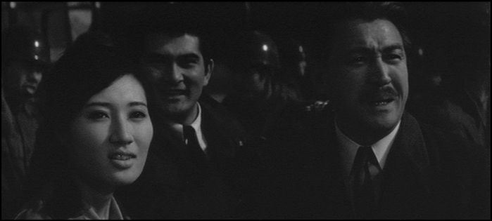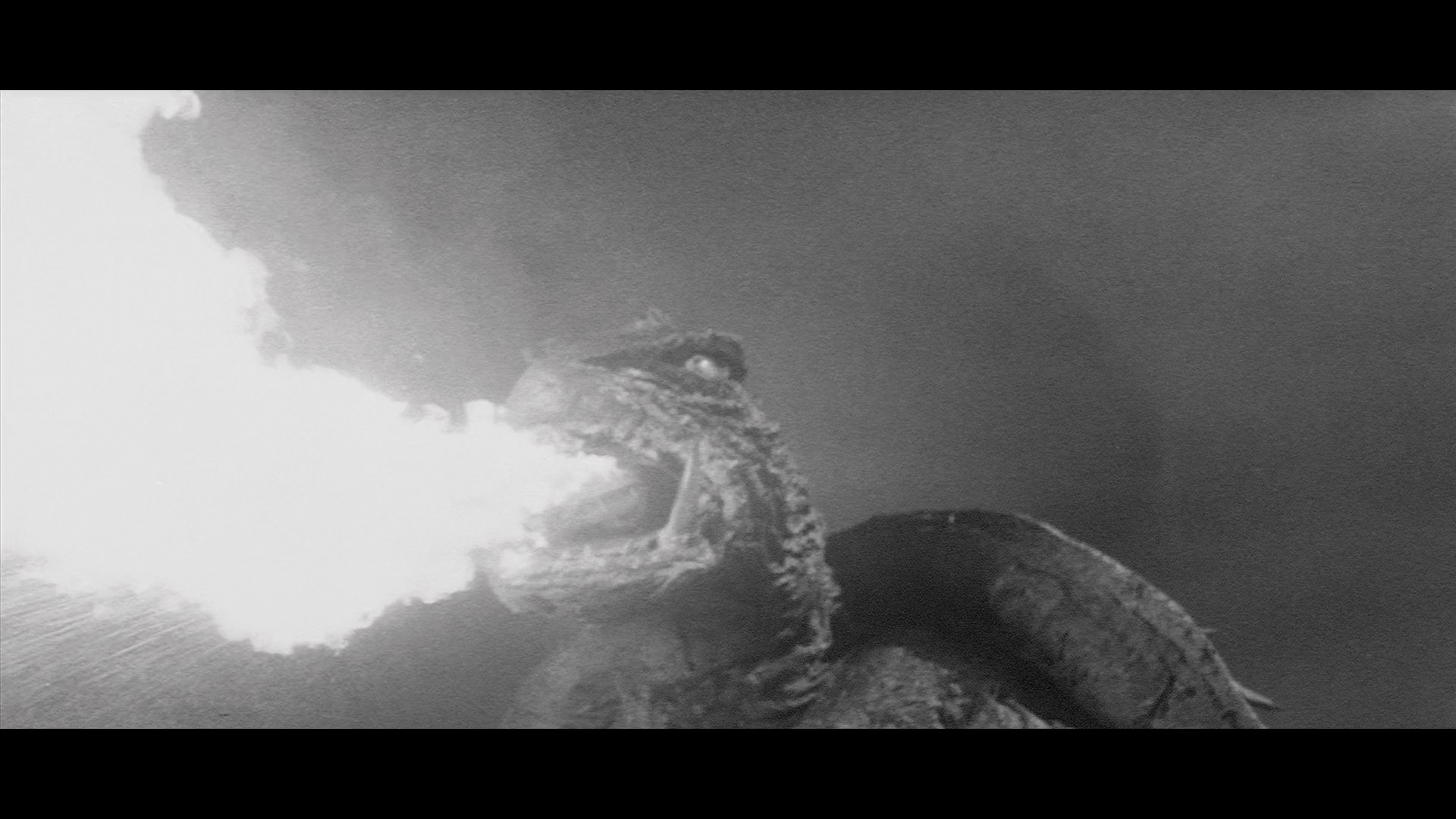 prehistoric Gamera from his sleep during a skirmish between American and Russian jets, and he soon makes his way to Tokyo while attacking a hapless ship in his path. Soon the entire city is under siege from the lumbering beast, and when his flying abilities stymie the military's attempts to crush him, scientists come up with a novel way of dealing with their big turtle problem. Fast-paced and entertaining, this is easily the most serious film in the serious as well as the only one shot in black and white. Perhaps the most startling element is the leading man, Dr. Hidaka, is played by Eiji Funakoshi, best known for much more traditional dramatic fare like Fires on the Plain, An Actor's Revenge, and a slew of Yasuzo Masumura films like Blind Beast and Manji; apparently he had a good time, since he returned to the series again a few years later.