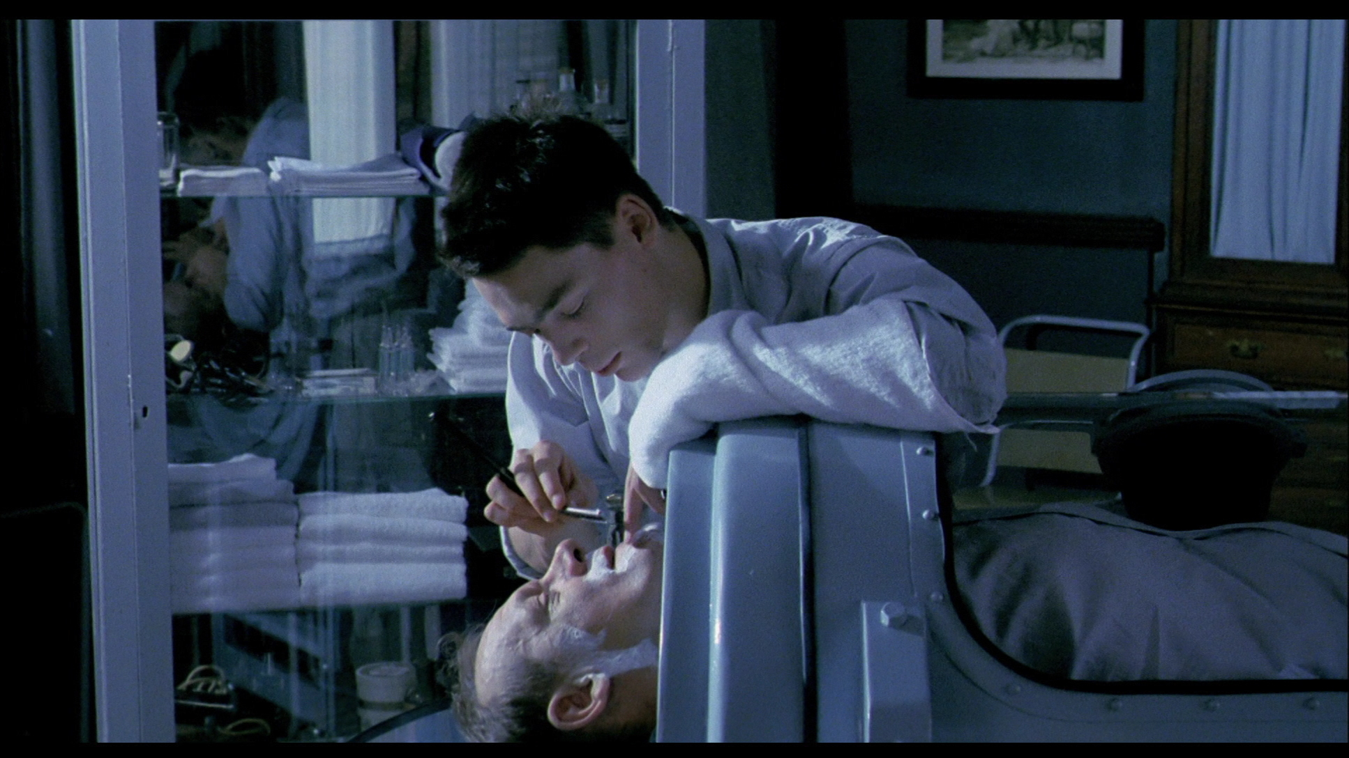 Since In a Glass Cage was barely exhibited in theaters, most viewers were first forced to watch it in a fuzzy, murky VHS transfer from Cinevista. Cult Epics' DVD offered a step up in several aspects, starting with the far more legible, optional English subtitles, but the non-anamorphic presentation revealed an uncomfortable amount of debris and compression flaws. Initial pressings also featured some dialogue out of synch for several scenes, but this was corrected for subsequent versions. A very strangely framed Villaronga appears for a lengthy video interview in which he discusses several aspects of the film, from handling the underage actors (whose scenes were treated as a series of innocent games later manipulated through editing into nightmare material) to the artistic inspirations for the striking, steely blue color scheme.