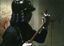 The most notorious episode, Flower of Flesh and Blood, instigated the apocryphal Sheen/FBI incident and spurred on a memorable Chas. Balun article in Deep Red; this is really video-driven sadism boiled down to its most visceral elements, a quasi-snuff sketch in which a grunting brute in a samurai costume kidnaps a young girl, ties her to a mattress, sacrifices a chicken, then carves her up for the remainder of the film while delivering giddy monologues about flowers directly to the camera. Though filled with spewing bodily fluids, screaming, and shaky, faux-realistic videography, this is less harrowing than its predecessor mainly because of the sheer hyperbole of the effects (in which every chop and hack seems to unleash torrents of blood) and the killer's bizarre appearance, which is probably meant to be some sort of commentary on feudalism's lingering fallout in Japan. Or maybe not. Adventurous viewers may want to pair this up with the earlier Japanese abduction/limb-removal study, Blind Beast, for a particularly harrowing double feature. Appropriately, the U.S. disc of Flower is packaged with The Making of Guinea Pig, a clinical behind-the-scenes chronicle of the extremely wet latex effects required to pass off each dismemberment and disembowlment. Even after this hour long documentary became an official part of the series on the video gray market, stories lingered for years about the verisimilitude of certain sequences.