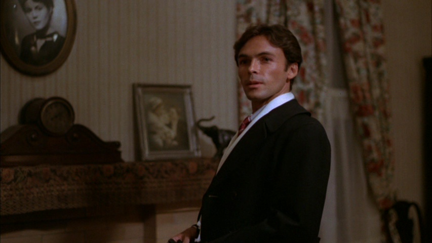 yet with dead-on skin tones and a significant boost in detail with the fabrics of our heroine's outfits in particular looking a lot more tactile than before. It's much brighter than the Scorpion with less of a blue tint, adding a substantial amount of extra image info and correcting some vertical squish as well. It's a pretty flawless presentation, and the DTS-HD MA English track also sounds pristine; optional English SDH subtitles are provided. Extras include the theatrical trailer, a TV spot, a gallery of promotional artwork and photos, and most substantially, "Satan Get Behind Thee" (20m39s), a new interview with Gautreaux. He chats about how screen testing for the lead in The Final Conflict (or Omen III as he calls it) played a major role in his part in this film, the frequent industry confusion about his age, the character instructions he was given by his director, the difference of the script's original ending, his original script notes (which he shows off for the camera), the "epic fornication" he anticipated from his love scene, and a great George C. Scott anecdote tied to, of all things, Galaxina and Marlon Brando. Needless to say, it's nearly worth the price of the disc all by itself. A limited 1,000-unit edition version with an exclusive O-card designed by Chris Garofolo is also available directly from Vinegar Syndrome. SCORPION RELEASING FRAME GRABS