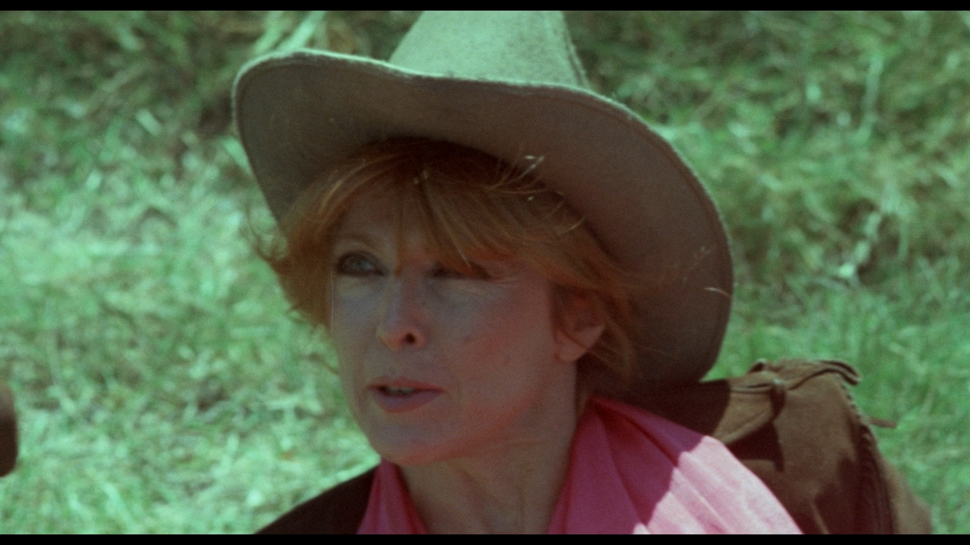 Barely released on VHS in the '80s, Hell Riders made its disc bow in 2020 as part of the Vinegar Syndrome Archive Blu-ray line, only available via the company site and select retailers in a limited 3,000-unit run (complete with a double-sided poster and reversible cover art). The new 2K scan from the 35mm original camera negative looks excellent with gorgeous colors and excellent detail from the foliage to the shag carpeting inside one character's van. The DTS-HD MA English 2.0 mono audio is fine with no significant issues, and the optional English SDH subtitles have some really odd transcriptions at times. ("Queen B?") In addition to a storyboard gallery you get a fun video interview with Bryan, "Straight to Hell" (15m16s), who chats about how some of the rent-a-gang amateur actors were recruited, the less than cooperative attitude of his time-obsessed leading lady (as opposed to the "jolly" West), his enjoyable collaborative process with Harmon, and Harmon's ingenious location scouting that nevertheless required some crafty sound recording to catch all the dialogue.