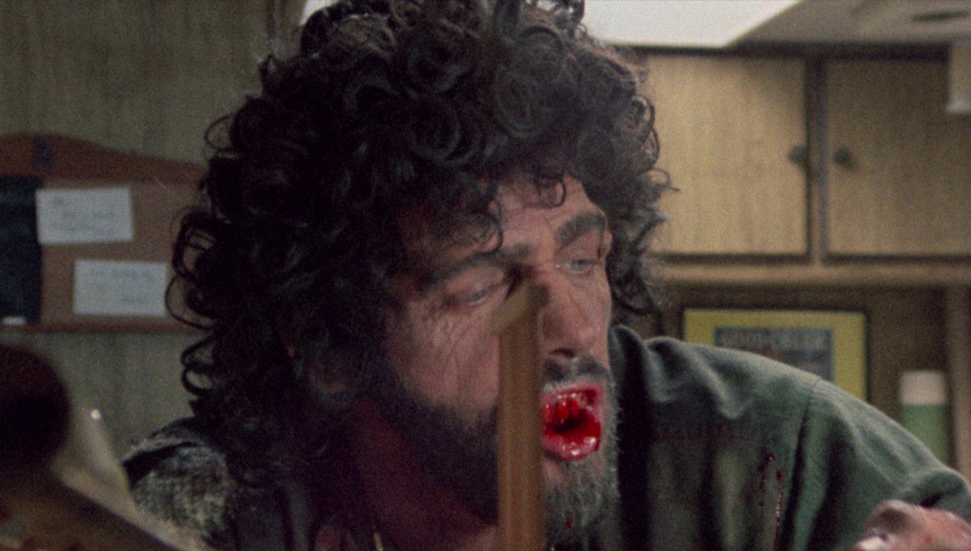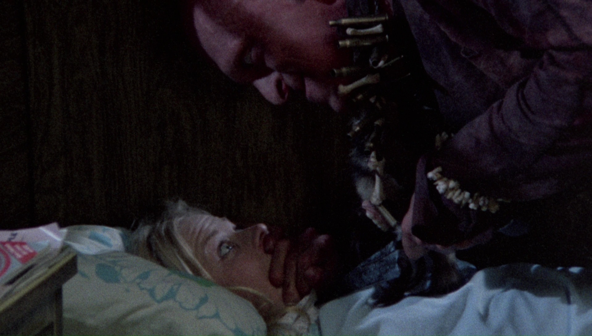 Anyone pining for a worthy transfer of this film will find their prayers answered with the 2016 edition from Arrow Video, issued as a Blu-ray in the U.S. and separate Blu-ray and DVD editions in the U.K. Touted as a "brand new 4K restoration from original film elements" supervised by Locke, it dispenses with the gimmicky 7.1 remix from the earlier editions and goes back to the original, superior mono English mix (with optional English subtitles). The image quality is such a tremendous improvement in every possible way it's astonishing; there's far more image information in the frame, the compositions are more coherent and well judged (here's one of the worst offenders from the older transfer for comparison), colors are more natural with greater range and actual flesh tones, the night scenes are more clear and impressive... well, you get the idea. The only minor issues are some intermittent fading visible on the far right side in some of the darkest shots (most obviously the opening credits and the infamous baby scene) and a reel in the middle where the color looks less saturated than the rest of the film, but that's easy to overlook considering how superior this is in every way over anything we've had before. Interestingly, the alternate ending is included here both as a standalone extra and as an option to be played with the main feature, which runs 91 minutes