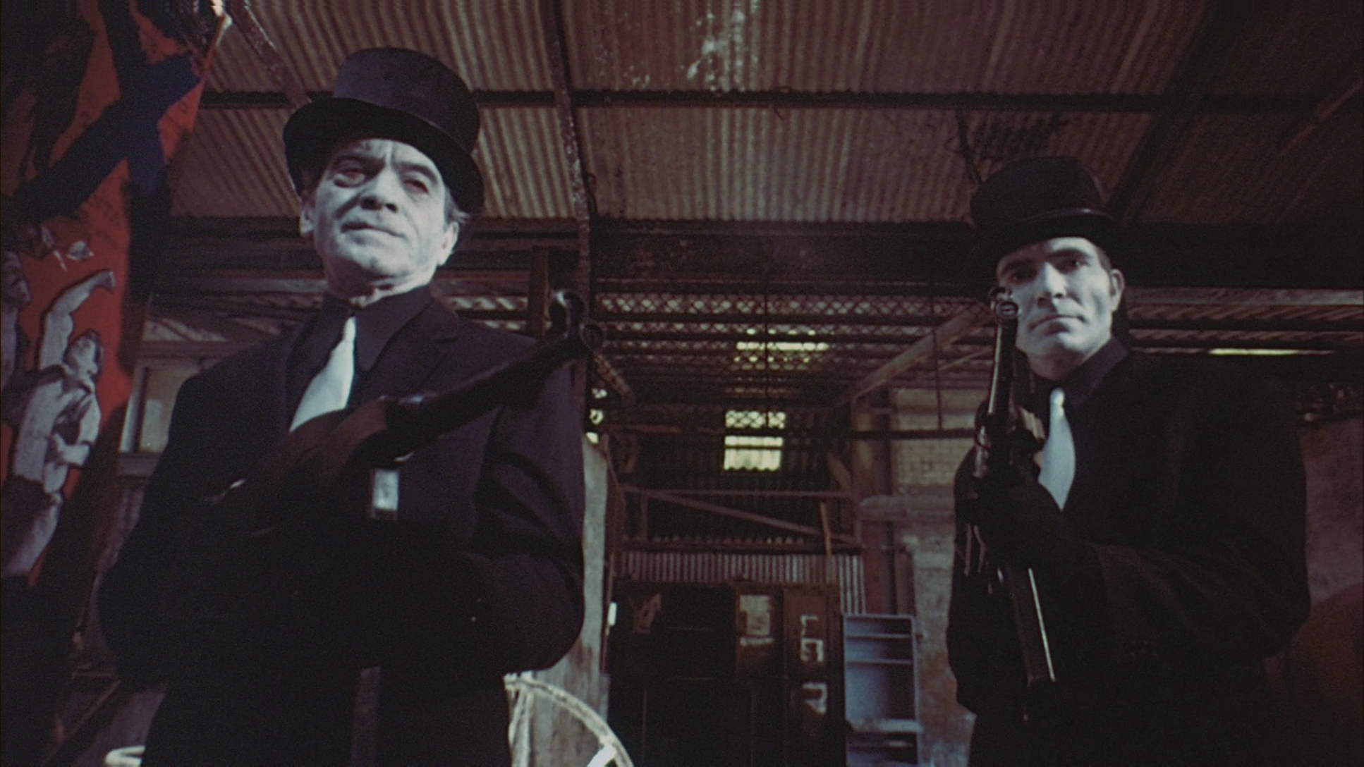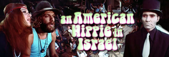 Vietnam vet from New York being followed around the world by a couple of sinister, blank-faced guys in top hats and white makeup. Upon arriving in Israel, Mike catches a ride from the airport with a local actress named Elizabeth (Avidan). "Are you a hippie?" she asks. "Well, you might say so," Mike answers. "Right on." His stories about combat trauma manage to get Elizabeth all heated up, leading to much happiness, cavorting, and congregating with more folk-singing hippies -- who get pumped full of bullets by the those two white-faced guys, now toting machine guns. Joined by two fellow survivors of the attack (Wolf and Karney), Mike and Elizabeth jump in the car and head out to the desert where Mike has a crazy silent trip involving a sledgehammer and big tape computer things with legs. Their ultimate goal? To reach an island where they can live in peace with a goat, but alas, the world just won't let 'em be free without a fight... Swiftly consigned to oblivion after its completion, this bonkers '70s curio was unearthed by Grindhouse Releasing and tantalizingly sat on their upcoming release schedule for many years. Some wondered whether this thing was even a real movie, but yes indeed, it exists, and it's... astonishing. This is definitely a product of the same era that produced drug-addled oddities like Chappaqua, Zachariah, El Topo, and Zabriskie Point, albeit with far more humor (intentional or not) than all of those combined. Shot in English but apparently looped with different voice talent in post-production, it starts off as a batty conflation of hippie cliches but quickly veers off into very weird surrealist territory. Anti-materialist monologues bounce off scenes involving love-ins, killer sharks, extensive nudity, and other arbitrary madness, all shot with a hazy art film gauze that makes it now feel like a product from another planet. It's easy for a modern viewer to just sit back and laugh at all the groovy lingo and melodramatics, which seems to be the most common way of watching the film now, but if you try to figure out where the heck this actually came from and try to enjoy it as a cracked piece of experimental theater gone off the rails, you'll have a much better time.