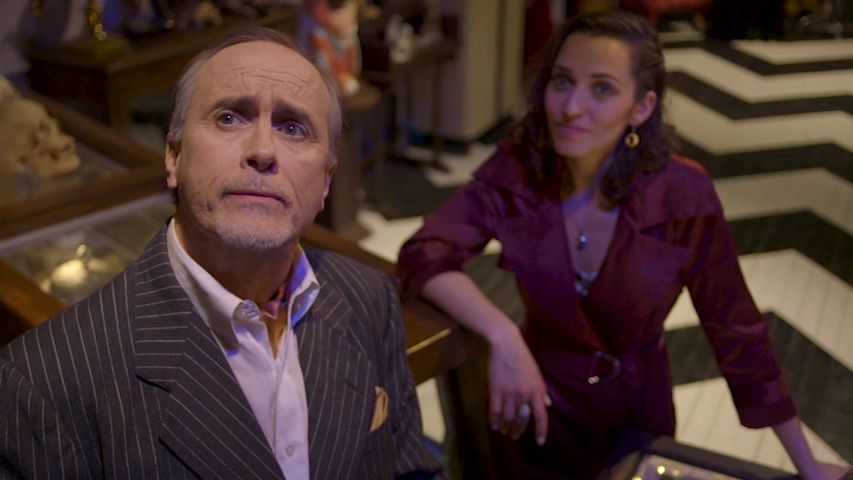 have been getting a fair amount of traction with the likes of A Christmas Horror Story and All the Creatures Were Stirring, but the concept gets tweaked considerably with Holiday Hell, an Amicus-inspired omnibus that expands the idea to encompass the entire winter season. It also marks the most recent film for Jeff Ferrell (Ghostlight), who handles 25% of the directorial chores here and reunites with many participants in his prior film, Dead West. This time he and co-conspirators Jeremy Berg, David Burns and co-writer Jeff Vigil get a major boost with the presence of the genre favorite Jeffrey Combs, who lends dramatic gravitas to the framing device and makes for the ideal casting choice when you find out exactly what's going on. Out shopping for a last-minute gift for her sister with bizarre and challenging tastes, Amelia (Karimi-Naser) ends up in a curiosity shop called the Nevertold Casket Co. run by none other than Combs, doing his best Peter Cushing impression. He manages to turn her gift hunt into a journey into the macabre by sharing the stories behind a quartet of troubling items starting off with a mask that leads into "Dollface," the tale of a deaf girl who joins some really repugnant college pals for a night at a crime scene house that puts them in the path of a masked killer. Though fairly standard slasher material for the most part, this one has a mildly clever little twist at the end that puts it over. Things escalate considerably with the rollicking "The Hand That