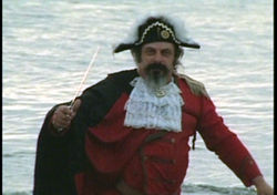earlier films. The plot (to use the term generously) revolves around the increasingly insane family of Don Martin (Lapidus), an aging, bearded actor who keeps his wife and daughters on an island with the promise of buried treasure. The girls have pretty much lost any inhibtions: bald Gina (Christie Levin) constantly wanders the beach nude apart from a knife belt (shades of Dr. No and Franco's The Perverse Countess), while slutty blonde Beatriz (Mavi Tienda) lounges around in skimpy lingerie to seduce local guitar plucker Herbie (Ezequiel Cohen) who deadpans, "I don't get horny from that kind of girl." Apparently Gina is more to Herbie's taste, and he shows her a treasure chest he's discovered containing gold coins. Meanwhile the patriarch's sanity begins to crumble as he suspects his wife of infidelity, leading to a bloody finale straight out of Beyond the Valley of the Dolls that finds him running amuck with a sword while dressed as a pirate.