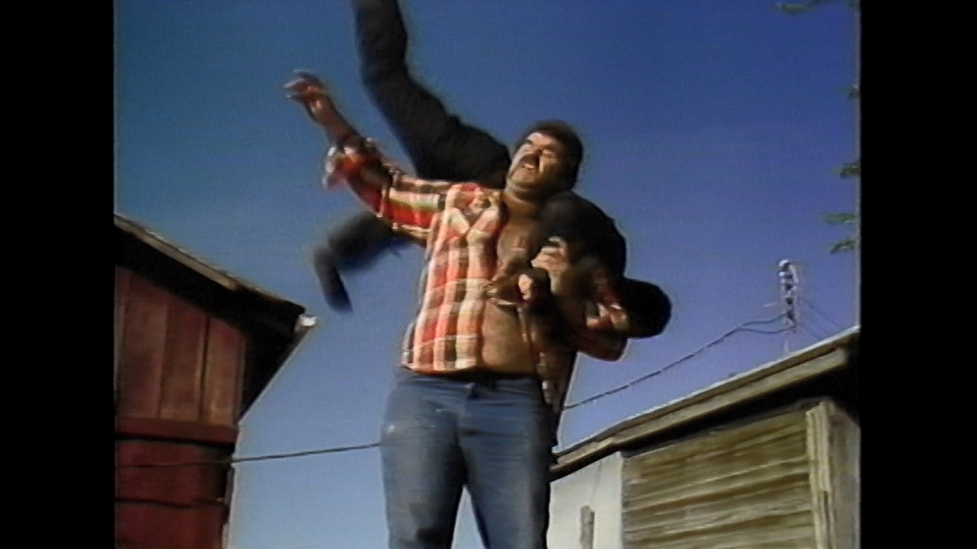 But wait! You say you want to see that entire How To Become a Ninja video and learn how to dress in black from head to toe so you can fight people in your own backyard? Look no further than the second Blu-ray, which features the whole 60m43s opus with White showing how to disguise yourself, lay out weapons across your lawn, and avoid injury as you go about your stealthy mission. Then you get a 1m44s TV news segment on the making of Justice Ninja Style, a batch of 1989 raw footage from the Ninja The Ultimate Warrior shoot (37m8s), a "Six Flags Ninja Media Day" celebration with White at the opening of the Ninja rollercoaster (42m44s), and a very hefty 17m21s image gallery with lots of production photos. Dig a tad further and you might also stumble on 1993's "A Really Good Rocker: The Making of the Music Video" (29m34s), featuring Rykart and fight choreography by White. If you ever wanted country line dancing and bar fight choreography from a Grand Master all in the same place, look no further.