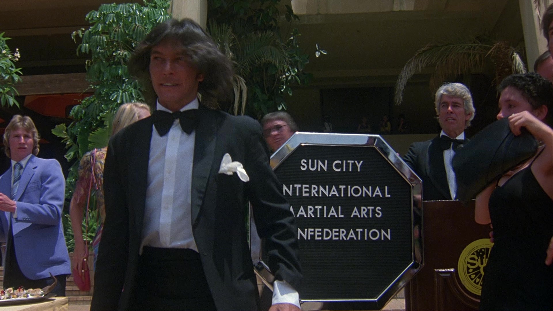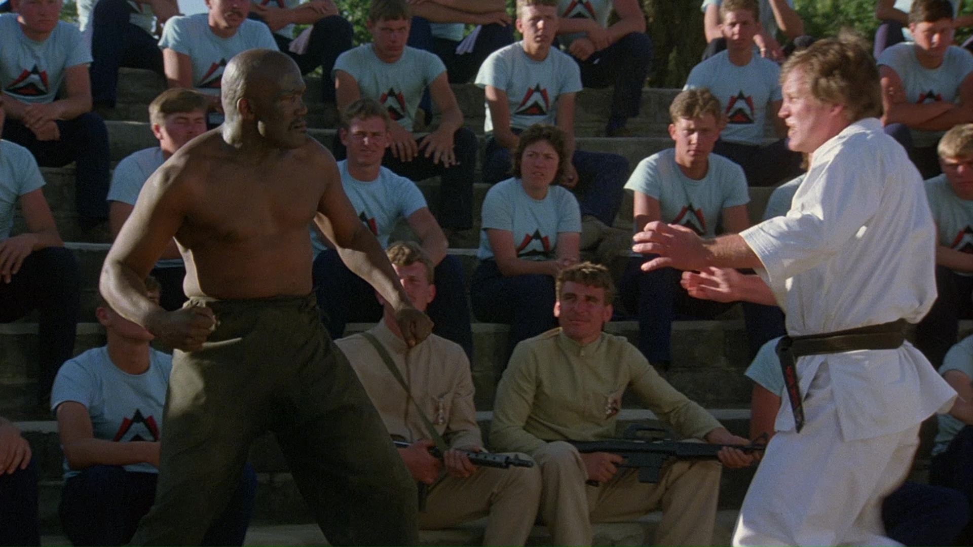 with a hilarious fake beard), an Enter the Dragon-style baddie with an army of henchmen, a hot-pink-haired cohort named Minerva (Wilson), and karate-trained underlings in his Middle Eastern camp. Steve assembles his own squad (mostly South African Shotokan fighters) with members like the Fly (Schmidt), Hot Dog (Flynn), and Gorilla (The Wild Geese's Gampu), and they promptly head out to "New Babylonia" to kick some evildoers' butts.