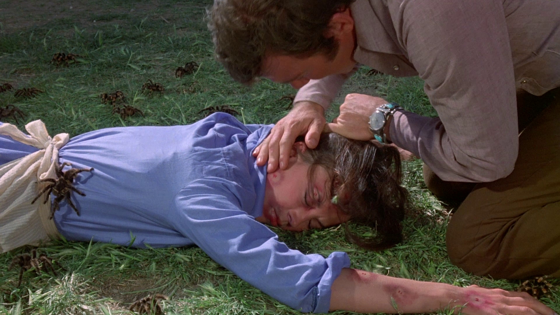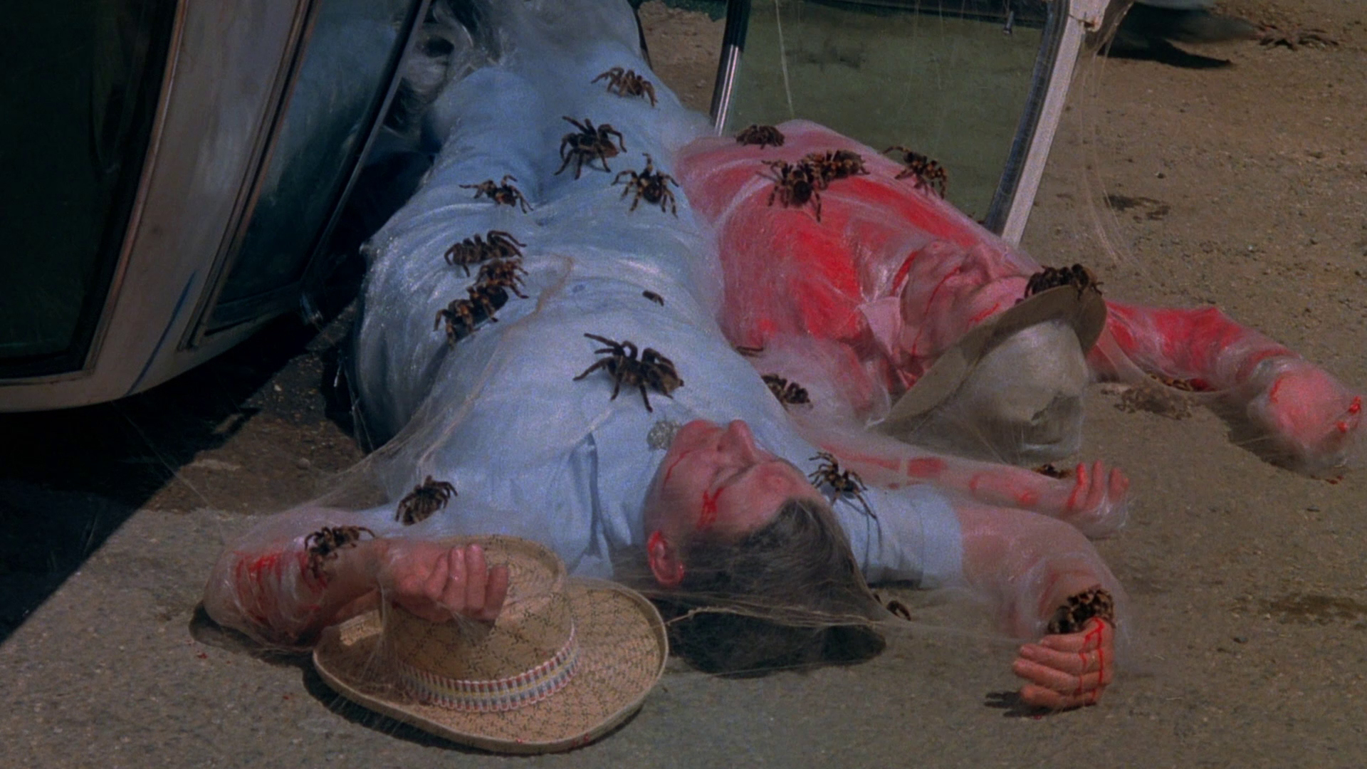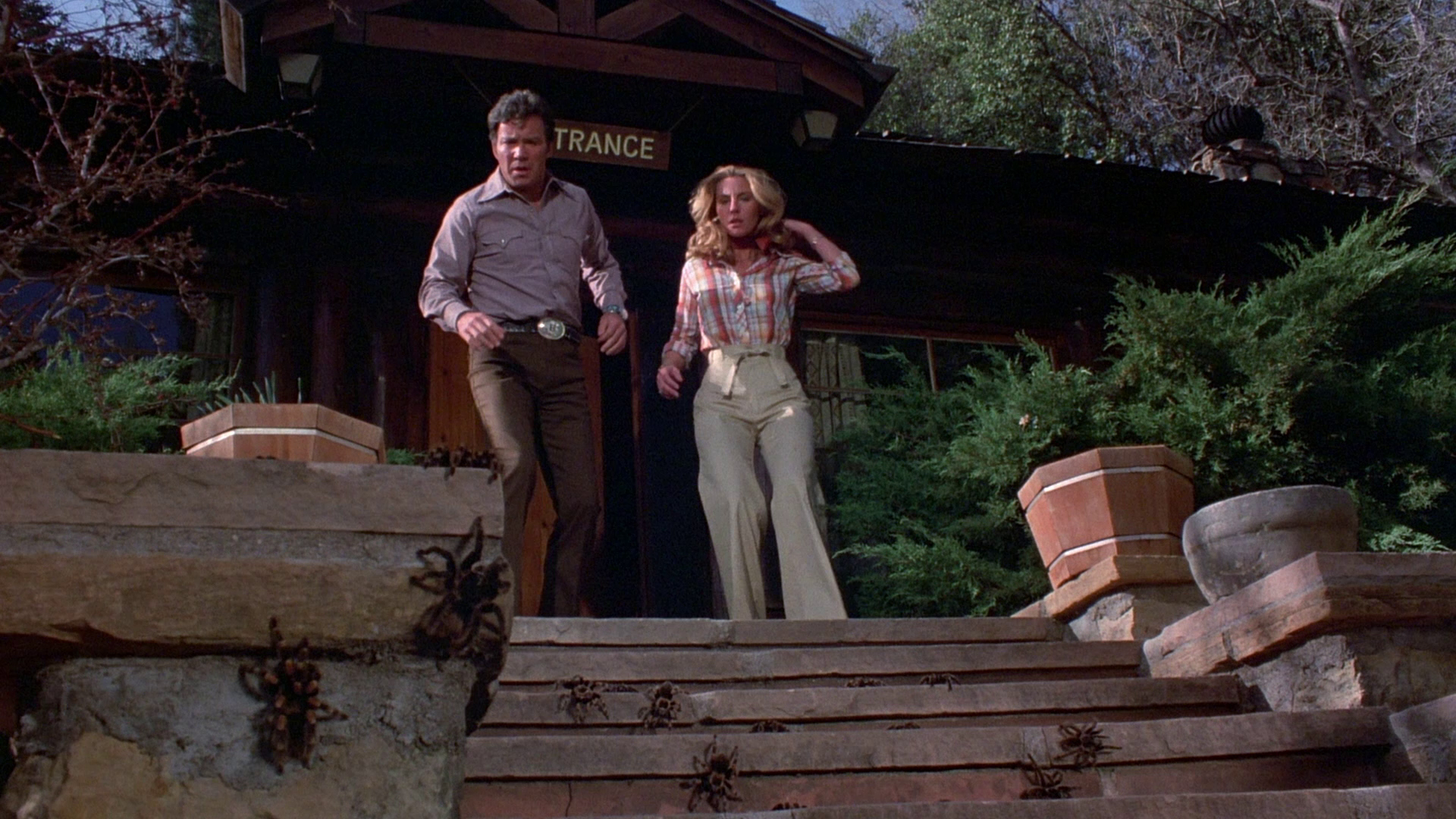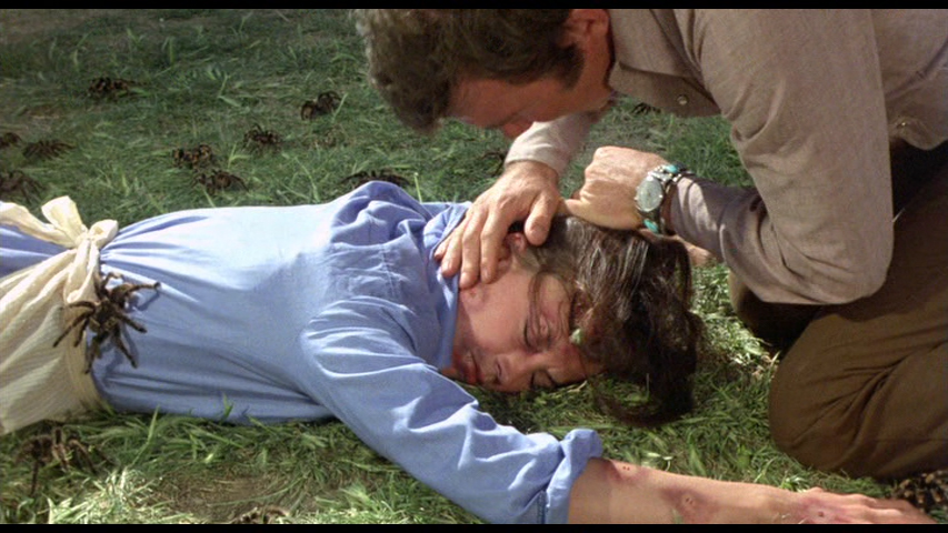 full frame transfer and zero extras. Shout! Factory stepped up with the film's first special edition in 2010 on DVD, featuring an assortment of extras partially commissioned through Code Red including a fun audio commentary with Cardos, producer Igo Kantor, spider wrangler Jim Brockett and cinematographer John Morrill, moderated by Lee Christian and Scott Spiegel. You get a lot of spider stories here of course, including notes that they did their best to not pulverize very many of them (though some get visibly run over and stomped, unfortunately), as well as tales of Shatner and Bolling working with their furry co-stars. There's also a separate Shatner interview (16m35s) that'll make you sad he never got around to doing the planned sequel, a really fun piece with Brockett and Christian (12m23s) showing off some real-life varieties of tarantulas with very different personalities, a quick chat with co-writer Stephen Lodge (4m40s), a reel of Super 8 behind-the-scenes footage (17m18s), the theatrical trailer, and a gallery including stills and pressbook material.