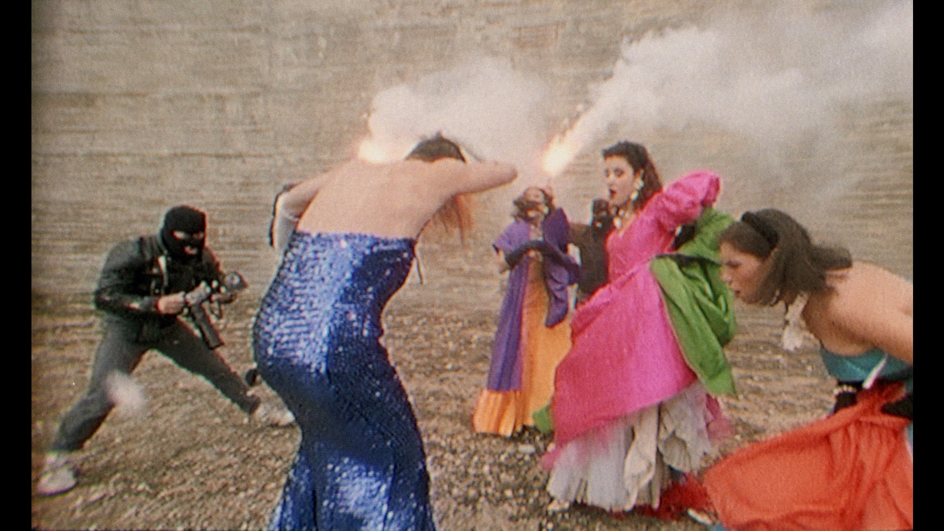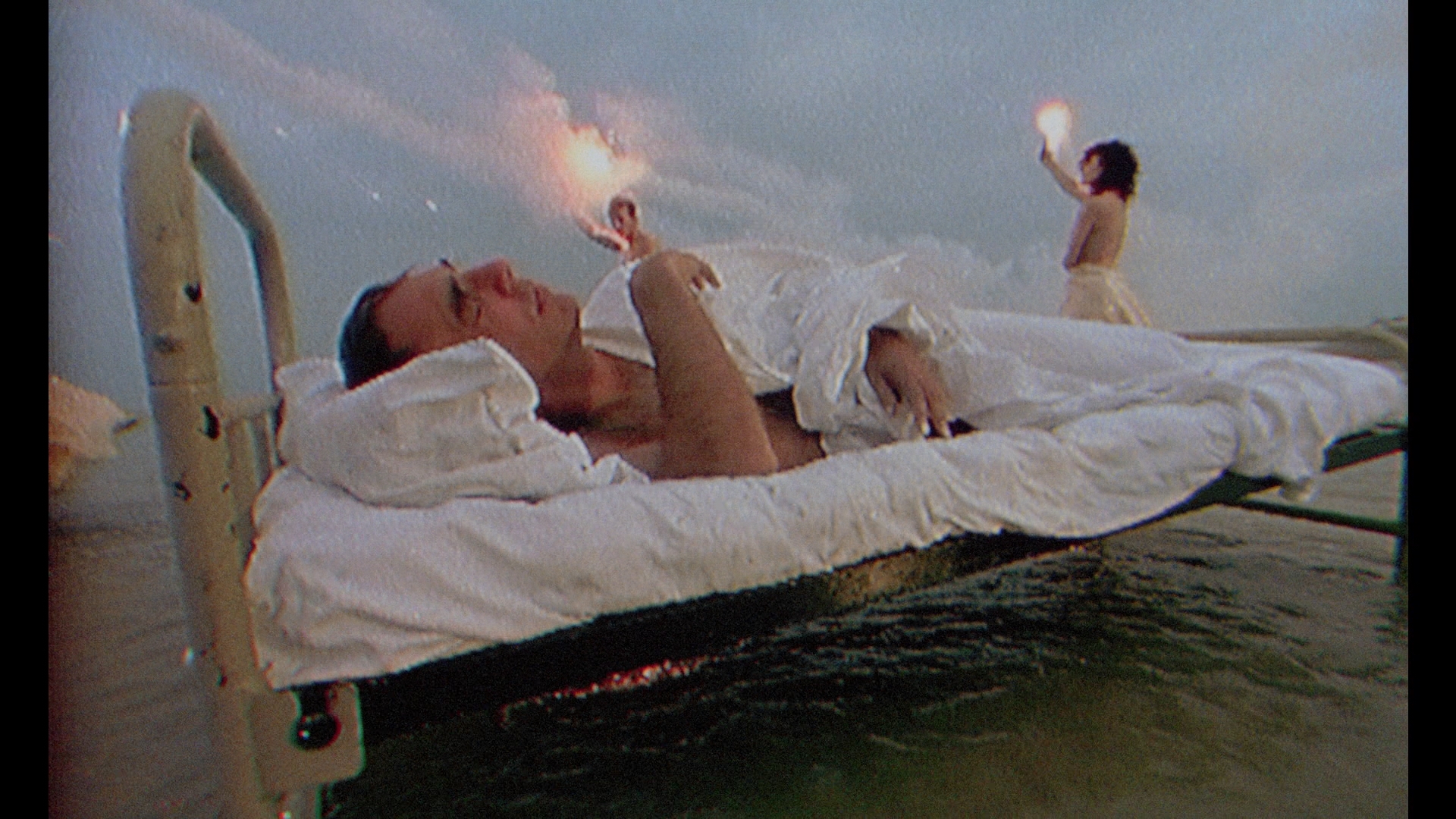 Andrew TIernan in a sort of narrative industrial surrealist short about a young man drifting through a colorful cast of characters and getting seduced by a woman who hangs out with someone in full body bandages, all accompanied by an unnerving soundtrack by Psychic TV and culminating in one of the strangest "sex" scenes around. The short's director, David Lewis, also appears for a new interview (15m15s) about how he first met Jarman at film school and assembled such a wild crew to appear in a film in which the power of the imagery compensated for the fact that "I had no idea what the hell I was talking about!" "Remembering Derek Jarman" (12m36s) from the BFI's 2014 Jarman season event with Richard Heslop and producer James Mackay chatting with BFI curator Will Fowler about their various collaborations including a very interesting bit about The Smiths' "The Queen Is Dead" music video. Mackay also appears in a separate new interview (14m8s) going more in depth about the film's abstract and political nature and how it posed a challenge at festival screenings. "Don Boyd Remembers The Last of England and Aria" (15m38s) offers a production overview of both projects, including the distribution of this feature and a particularly colorful remembrance of how Jarman selected a piece for the latter film, including the amusing idea of selecting a piece with Florence Foster Jenkins. Then Jarman collaborator and occasional co-director John Maybury appears in "Another World for Ourselves" (8m56s), chronicling their path together starting at a Siouxsie and the Banshees concert and extending through years of blending the line between music and cinema. "Isle of Sheppey" (7m) is a rough reel of VHS-shot footage from Jarman's location scout with cultural historian Jon Savage; it's tough to make out what they're saying for the most part, but it's fascinating to follow Jarman's eye behind the camera looking around for potential spots. "Depuis le jour" (4m55s) is Jarman's segment from that opera all-star director omnibus Aria, featuring Swinton looking especially radiant, with optional audio commentary provided by Boyd. In "Another Derek" (4m55s), artist and
