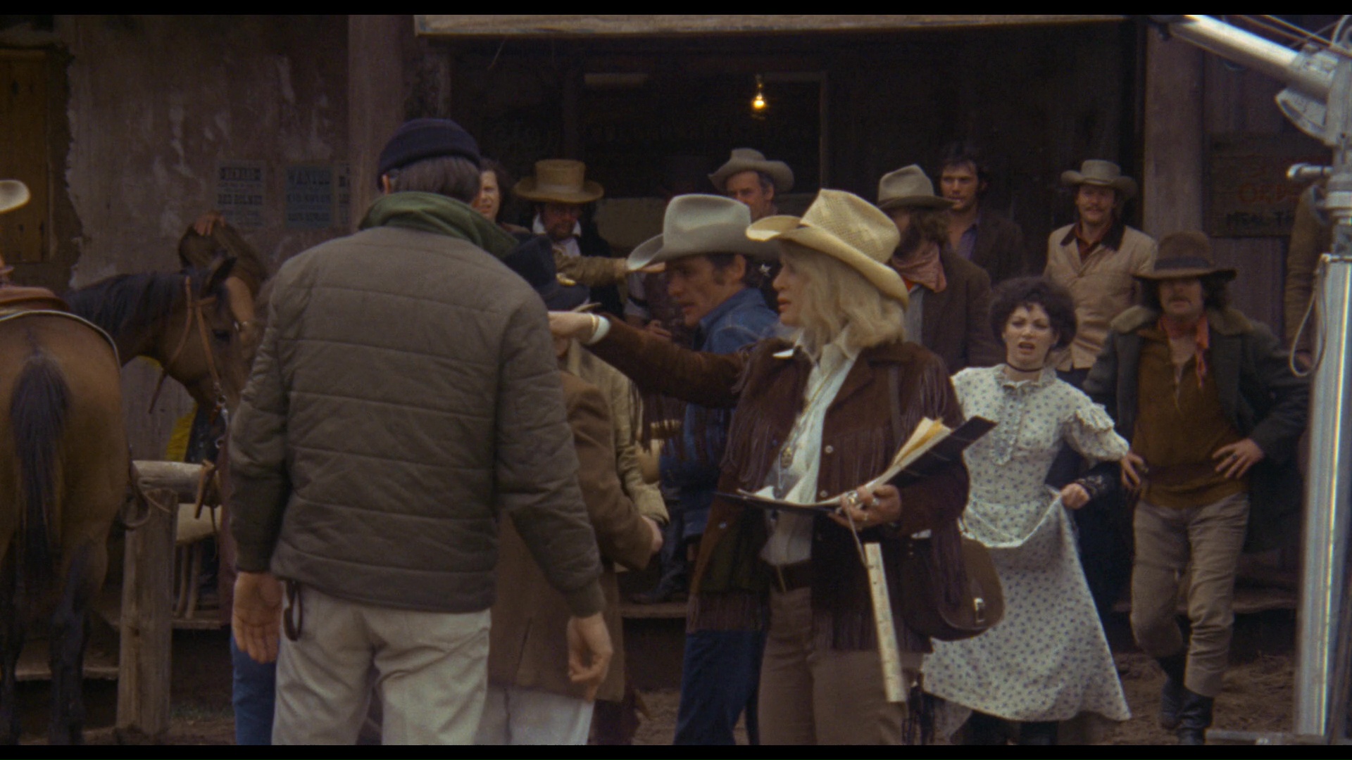 population, who have decided to embark on enacting their own "film" (with sticks arranged into a "camera") in an imitation of the visitors, albeit with Kansas now playing a very different role. An ongoing search for gold, a romance with a prostitute, and hazy abstract conversations also figure in the free-associative snapshot of the contrast between film and reality.