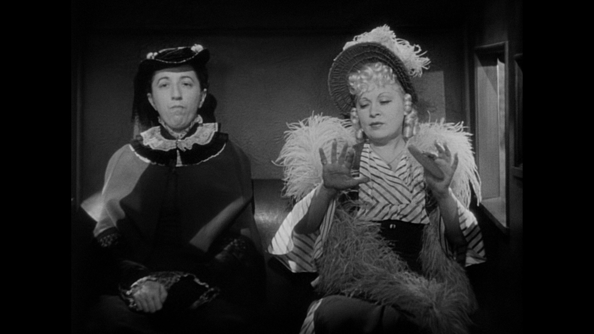 asserting a writing credit onto her script for his small one-scene addition. Whatever the case may be, the film itself is quite funny and charming as West goes, well, west again where, as Flower Belle Lee, she becomes smitten with the masked bandit who's holding up stagecoaches in the area. With her reputation besmirched by gossipy fellow passenger Margaret Hamilton (hot off The Wizard of Oz), she tries to set up a fake marriage with the presumably wealthy Cuthbert J. Twillie (Fields) while pursuing the bandit of her dreams. Obviously Universal was very confident in the production since they threw lots of costumes, sets, and extras all over the place, and at least on screen the teaming pays off with West and Fields getting to bounce off each other's personas (including a priceless final exchange). The Kino Lorber disc of this one featured a Heller-Nicholas / Nelson commentary, but this one features "A Love-Hate Relationship" (12m35s), a fascinating look at the film by Dr. Harriet Fields (yes, a descendant of the star himself) chatting about her obligation to keeping his legacy alive and how his career intersected with West all the way back to Broadway in the 1920s. The 4K restoration of the film (conducted in 2018) is pretty much spotless; it looks great from start to finish. Also on the disc is a big bonus, the 1982 made-for-TV biopic Mae West (95m32s) with Ann Jillian playing the Hollywood legend. Though she really doesn't look or act anything like the real-life West, Jillian is always fun to watch and gives it her all in a sparkly array of costumes worthy of the original herself. On top of that you get Piper Laurie as the stage mom from hell, James Brolin as the romantic interest, and Roddy McDowall as her gay best friend -- which results in the unforgettable sight of McDowall in drag. Perhaps the most surprising thing about this one is how dark and downbeat it is considering the subject matter, ending on a wistful note that contrasts a lot with the cheerful content elsewhere in the set. Also included are 1939's Hollywood Bowl (6m45s), another of those all-star cartoon pastiches with Fields depicted, the theatrical trailer, and a 65-image gallery.