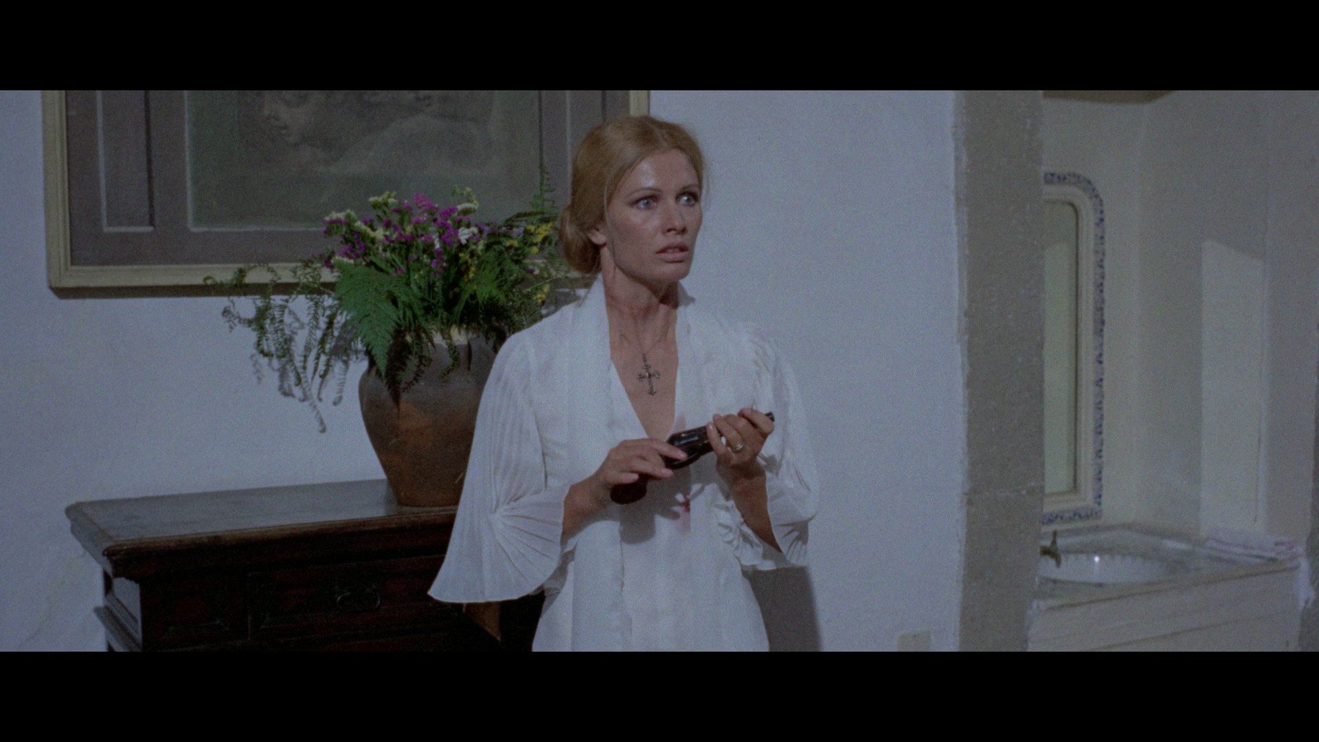 As good as that DVD was, the Vinegar Syndrome Blu-ray surpasses it handily with a rich 4K remaster that looks absolutely gorgeous (apart from that intentionally ragged opening scene). In addition to the DTS-HD MA 2.0 Italian track with English translated subtitles, this one launches into essential territory with the addition of the very elusive English track. It's actually a more enjoyable viewing experience that way as you get Kennedy's distinctive original voice here and some familiar dubbing artists filling in the rest of the cast (who were speaking a hodgepodge of Italian and English based on their lip movements). Optional English SDH subs are provided for that track as well. A different Foschi interview, "Giallo in Sardinia" (26m52s), covers his memories of the industry including his work as a dubbing artist, his experiences with Baldi after missing out on an earlier film together, and his thoughts on the cast. Nisbet returns again for a third video essay, this time looking at the body count giallo in more detail, Baldi's unusual one shot at the subgenre, and the ways this strays from the traditions of the time. The Italian trailer (this time with text cards) is also included.
