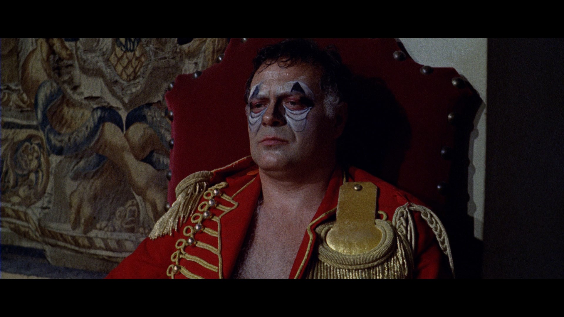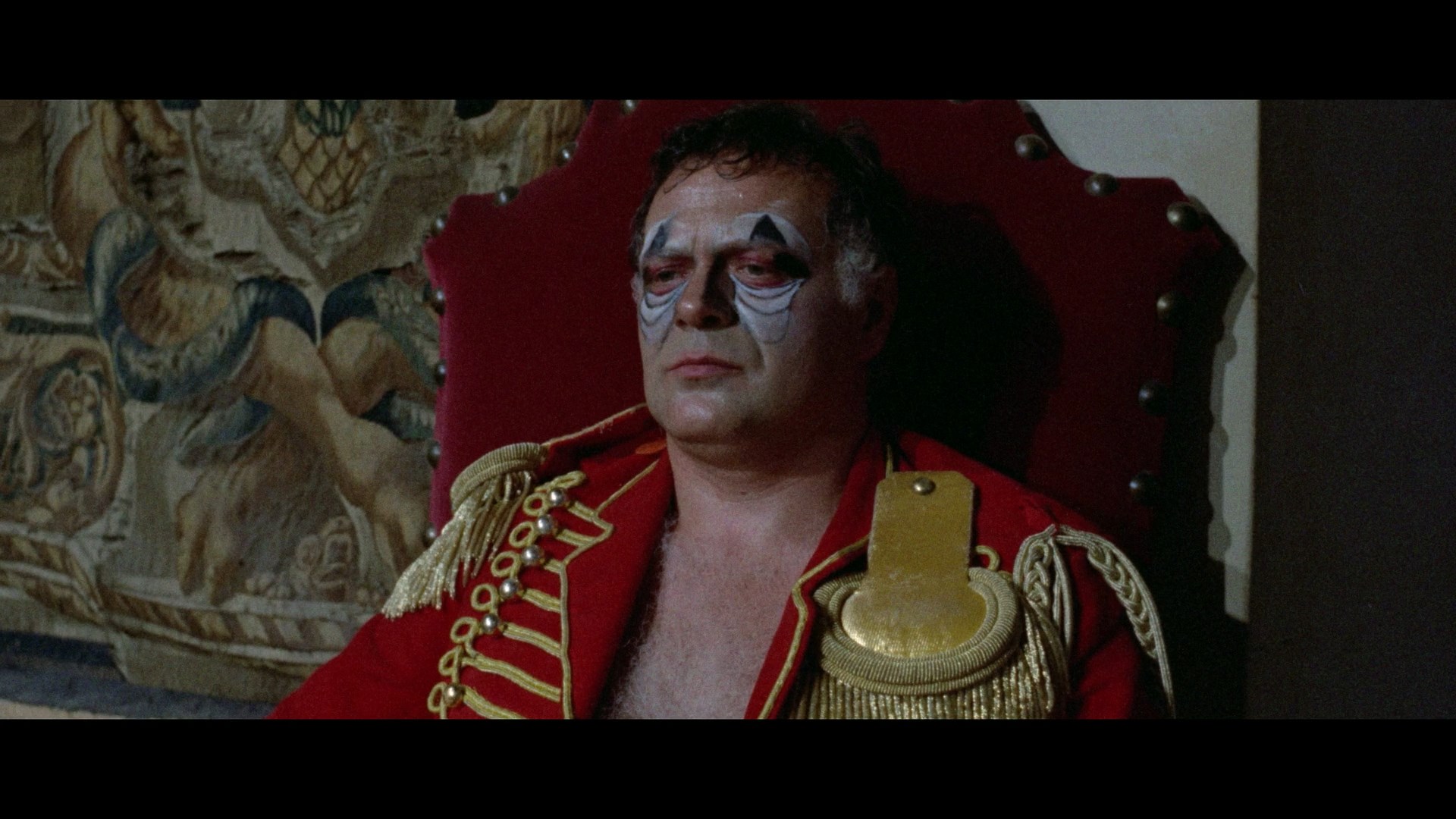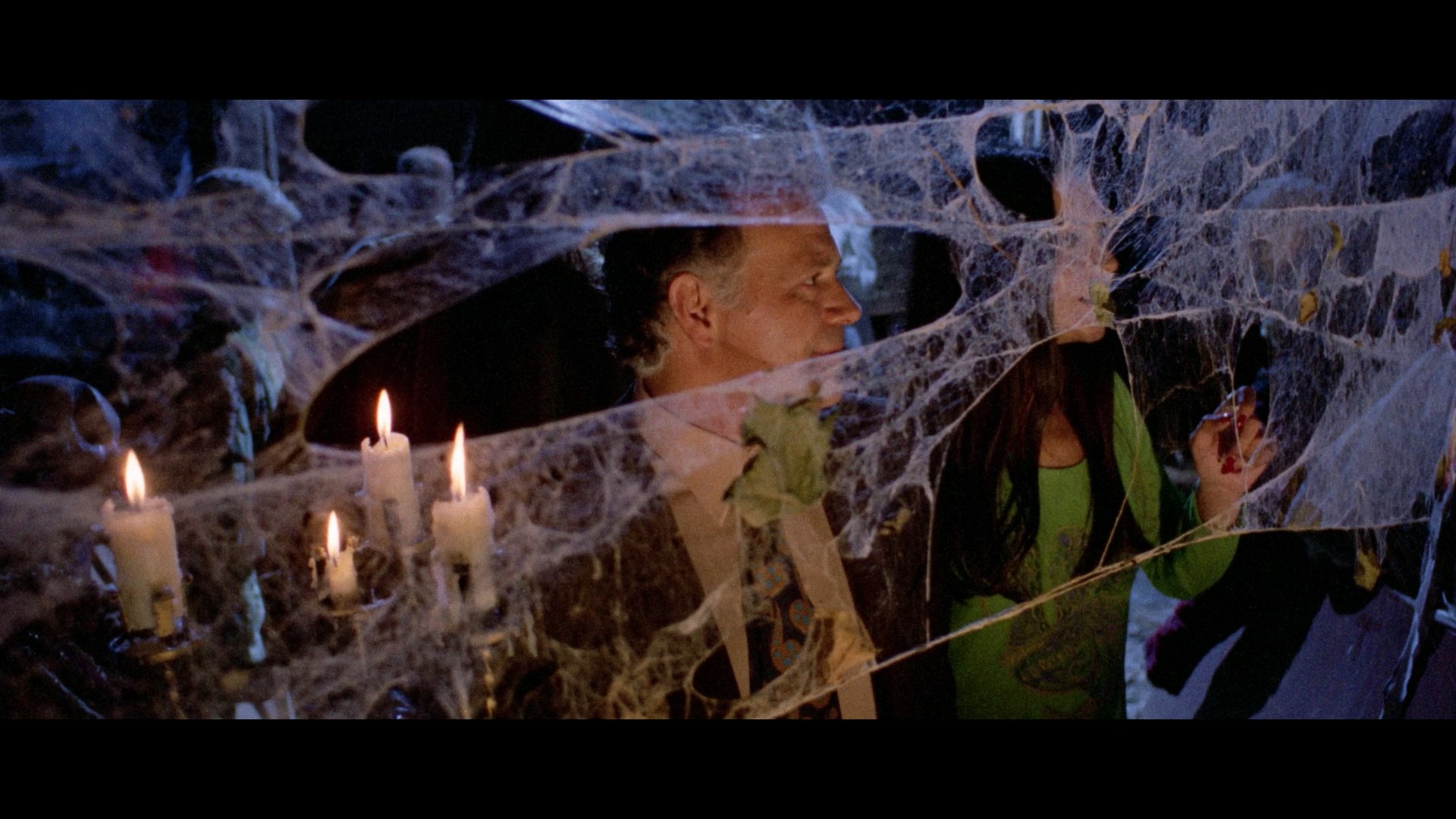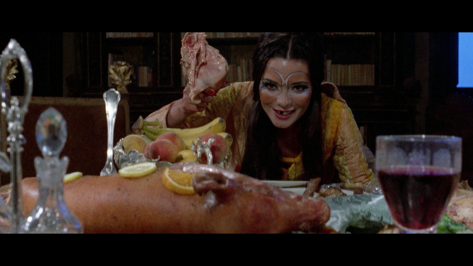 There's really nothing to complain about here; the film elements have been kept in spotless shape, and the quality here is light years beyond the old VHS version fans have had to put up with for years. The Italian 2.0 mono track also sounds very good, especially when it comes to Carpi's score, and optional subtitles are included in both English and German. There's also a fine audio commentary (in German with English subtitles) by label regular Christian Kessler and Marcus Stiglegger, who immediately refute Scavolini's dismissal of the film and cover the ins and out of the cast and crew while observing its often jolting visual flair. The rest of the extras are worthwhile as well, highlighted by a 36m42s interview featurette with Scavolini entitled "Esoteric & Cryptic" (whose meaning only becomes clear at the very end). He's very gregarious here and covers several decades in his career from his early avant garde work (including some technical film snafus) to his stint as a Vietnam war photographer, though obviously most of the time is focused on this film. He clarifies his previous disparaging comments, saying he thinks it should only be forgotten as part of his filmography, and explains how he only took the assignment under the condition that he extensively rewrite the script. Apparently the original version was more of a straightforward gory horror film, so Scavolini added the surreal banquet and orgy and made it more of an exercise in twisted psychology. (Don't worry, there are still several gruesome murders in the last act.) He also goes into the techniques he used to shoot the film in the comparatively limited Techniscope format but make it look like a much richer Panavision production, and yes, he briefly touches on Nightmare as well. He also lavishes praise on the Carpi score (including a cue he requested to sound as much like "In-A-Gadda-Da-Vida" as possible) and reveals that the film's lyrical theme was used to launch maiden voyages of the Concorde! Also included are the Italian trailer, the French trailer (under the title Exorcisme Tragique!), a 5m2s reel of minor deleted scenes, a photo gallery of stills and video art, and an English and German