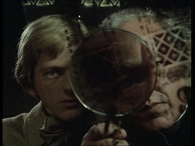 The third disc kicks off with my personal favorite of them all and one of the most difficult to see until now, "Lost Hearts." This one was covered last year in my Facebook roundup of the "Top 20 Scary TV Episodes," but for those who missed it, the story involves a young orphan named Stephen (The Tomorrow People's Gipps-Kent) who goes to stay with his mysterious and very odd Uncle Abney (Gorgo's O'Conor), an alchemist who has an intense fascination with keeping track of the boy's age. Stephen hears stories about two children, a gypsy boy and a young girl, who died on the property years before, and one night the two of them -- complete with blue skin and long, sharp fingernails -- begin prowling the house and lurking in his room, accompanied by off-kilter hurdy gurdy music. Oh, and their hearts have been ripped from their chests. A seriously unnerving predecessor to the vampire kids in Salem's Lot with a dash of Werner Herzog-style artiness thrown in, this is the shortest, tightest, and flat-out scariest film in the set, this one is a little different in that the real horror lies in the middle of the story rather than the end (which closes on an ironic and strangely whimsical note instead). It's not an all-out terror fest, of course, but the sight of those two undead kids smiling as they bob up and down the hallways is not easily forgotten. The picture quality here (once again sourced from the 16mm original) is leagues better than the cruddy dupes floating around for years, as once again this has never had a legit release until now.