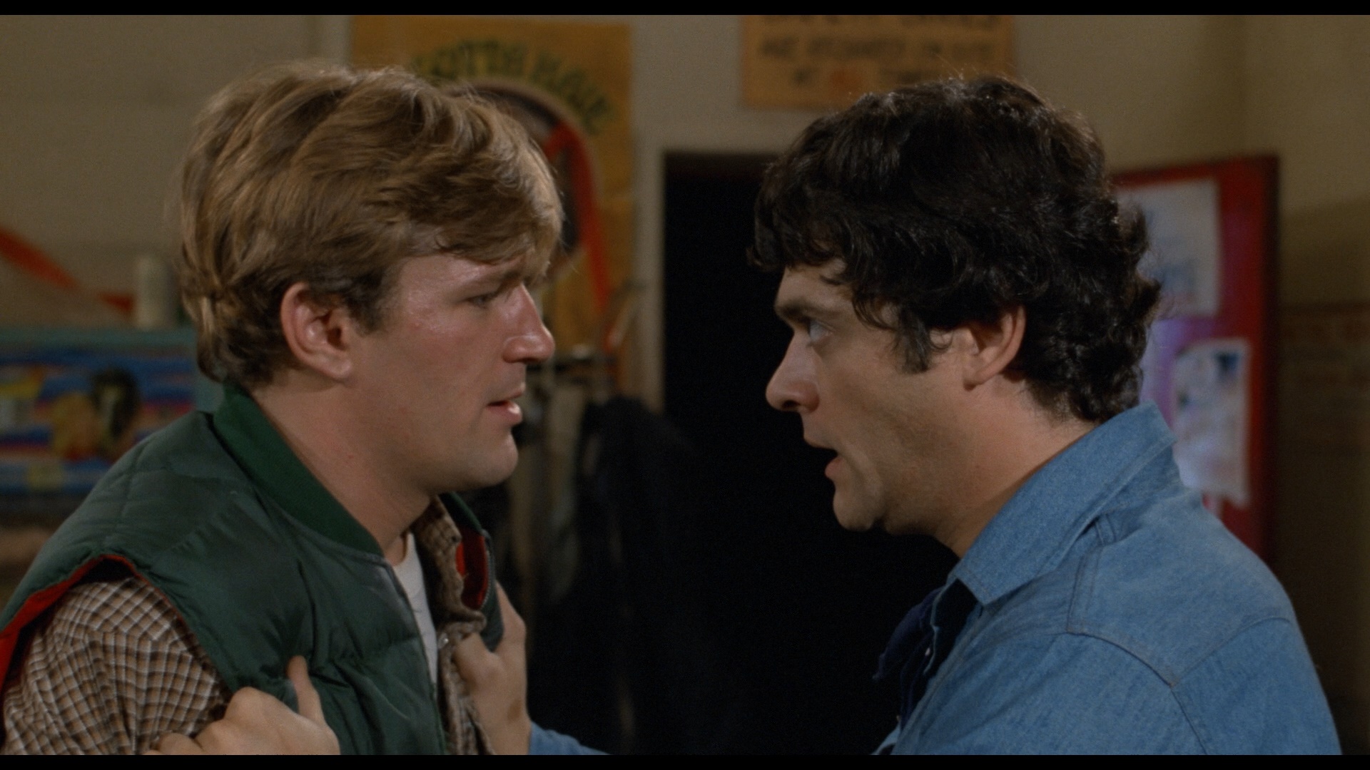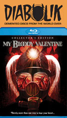 In 2009, the uncut version (or as close to it as possible) of My Bloody Valentine was released on DVD by Lionsgate to time with the theatrical release of the surprisingly solid 3-D remake, though the added footage was taken from a far more worn and desaturated source that stood out dramatically. (The R-rated version was also included, but who cares about that at this point?) A Blu-ray followed shortly afterwards, with a little extra color correction work done on the unrated gore footage but with the contrast in quality still very obvious. (Only one death sequence, a double coitus impalement during the third act, remains missing to this day.) Audio options include a modest DTS-HD 5.1 and original English mono (Dolby Digital) with optional English, English SDH, and Spanish subtitles. The main extra is the entertaining "Bloodlust: My Bloody Valentine and the Rose of the Slasher Film" (20m36s), with writer Adam Rockoff chatting about the evolution of stalk and slash from Grand Guignol through Hitchcock and Romero, after which director George Mihalka, Affleck, Hallier, actor Carl Marotte, and producers Andre Link and John Dunning explain how this film hurriedly came about to meet its release date and overcame obstacles like the mine locale getting refurbished against the production's wishes just before shooting. There's also a lengthy bit about the remake at the end with its cast and crew, too. The extra scenes can also be played separately (with a Mihalka and cast optional intros), followed by the trailer (actually a teaser) and a "Bloodlines: An Interactive Horror Film History" function that doesn't work on some players.