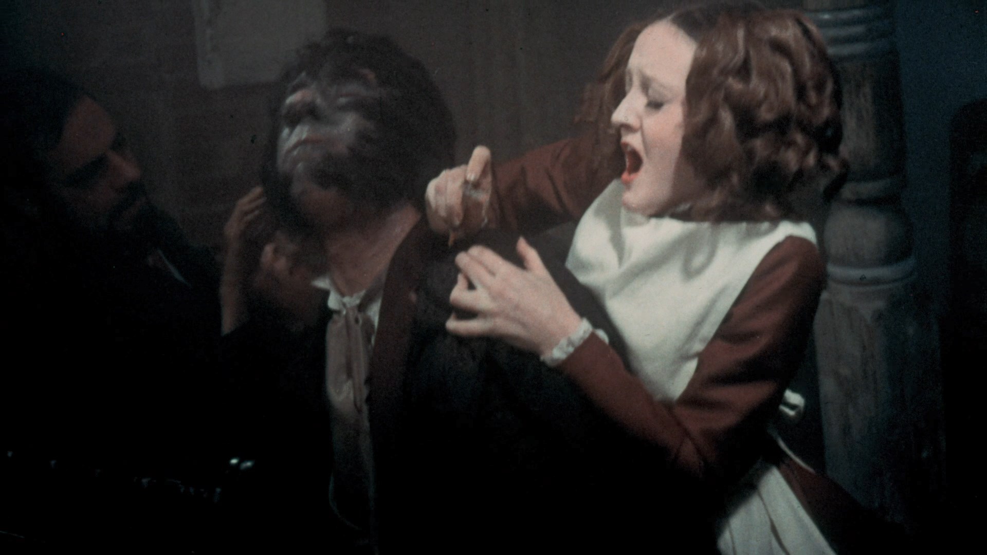 another Mishkin project, The Man with 2 Heads (first prepped as Dr. Jekyll and Mr. Blood). Audiences expecting a two-headed monster movie were more than a bit puzzled when they stumbled into this one, the second and last Milligan film to go out with a GP rating (after very extensive cuts, but more on that in a moment). Here William Jekyll (DeMarne) is conducting experiments in disproving the existence of the human soul and the afterlife, instead striving to isolate the physical causes behind good and evil. His experiments conducted with colleague Jack Smithers (Kaler) naturally end up taking a very dark turn when he transforms into the cane-wielding Dr. Blood, who haunts the red light district of London and indulges in every depravity his nice guy alter ego would never inflict on his wife, Carla (Lawrence).