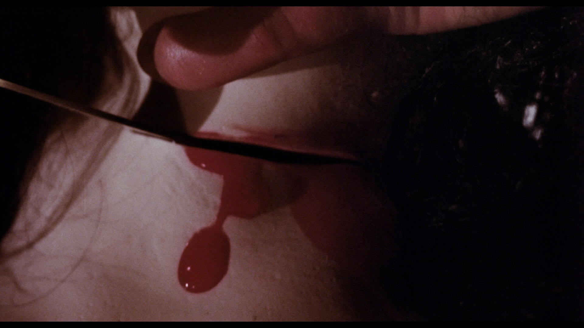 In late 2015, UK label 88 Films threw an interesting twist into the story of this film's video history with its separate Blu-ray and DVD releases as number 12 in its Slasher Classics Collection. The BBFC brouhaha long gone, the film was free to pass uncut -- and in a slightly longer version previously unseen on home video, clocking in at 99m4s (about 39 seconds longer than the longest U.S. cut on the Code Red disc). This doesn't consist of gore but random bits of scene extensions confined to the first third of the film, mainly bits at the heads and tails of scenes presumably lost due to element damage or removed for pacing reasons. The color timing is radically different here, looking brighter and cooler with more detail visible but whites also tended to bloom more; frame grab comparisons can be seen below so you can judge for yourself. The 88 Films transfer has a slight bit of extra info at the bottom of the frame, which means the already eyebrow-raising bit with the vibrator in the peepshow now reveals even more. The LPCM English mono soundtrack has been cleaned up quite a bit but features some pretty extreme leaps in volume, so be prepared to have your remote handy or any nearby pets or neighbors might get very