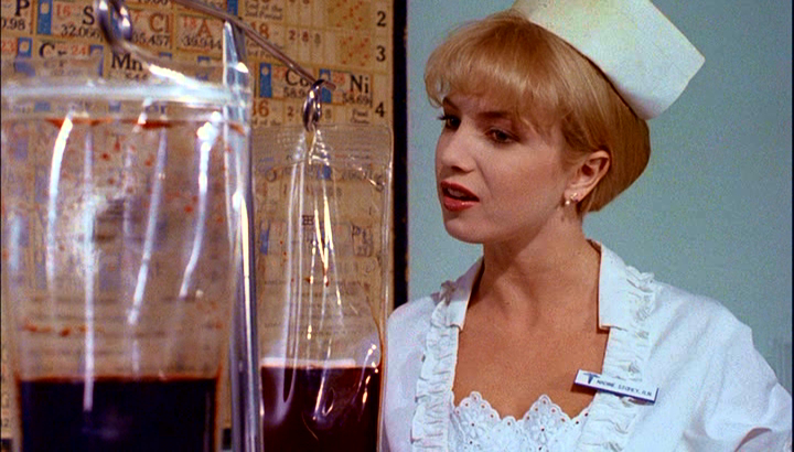 Of course, the film's real claim to fame is its status as the first legitimate starring vehicle for Traci Lords, who had just been busted by the FBI for performing underage in adult films since 1984. Theories still swirl around about the particulars of this case, but the aftermath was considerable with the entire industry shaken up and Lords going into temporary hiding. Wynorski managed to track her down and offered her the lead, prompting a lot of naysayers to doubt the entire project when it finally unspooled in limited release. Of course, Traci and company wound up having the last laugh as she turned out to be more than capable of carrying a film. Her charisma, gorgeous screen presence, and impish sense of humor (often direced at herself) quickly proved her dreams of crossing over were indeed possible, and soon she was popping up in everything from John Water's Cry-Baby to TV shows like Married... with Children and Melrose Place. She still continues to have a successful, well-earned career on both the big and small screens (a personal favorite: her femme fatale appearance on Andy Barker, P.I.), and she also released a surprisingly credible dance album and an autobiography between gigs. And to think, it all started out here with a sexy nurse's outfit. As for the film itself, it's a quick, cheap, often ramshackle affair with a lot of inexplicable detours and shameless cribs from earlier Corman films, but then again, what did you expect?