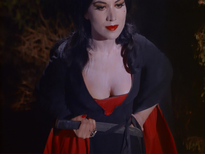 road down a small cliff. They're welcomed to a nearby cemetery by Criswell and his Vampira-styled, beehive-wearing sidekick (Silver), who subject them to ten summonings of cursed women beneath the full moon. What ensues is basically a string of topless burlesque routines involving a greedy woman dipped in gold (Barrington again in a wig) and numbers titled the Hawaiian Dance, the Skeleton Dance, the Slave Dance, the Street Walker Dance, the Fluff Dance, the Mexican Dance, and the Zombie Dance. Along the way, the provocative Silver starts jonesing to sink a knife into the human couple before their time to join the realm of darkness comes at dawn, and a werewolf and mummy show up to deliver wisecracks and tie the couple up for some added kink value. It all ends with a little twist ending, though it probably isn't the one you think.
