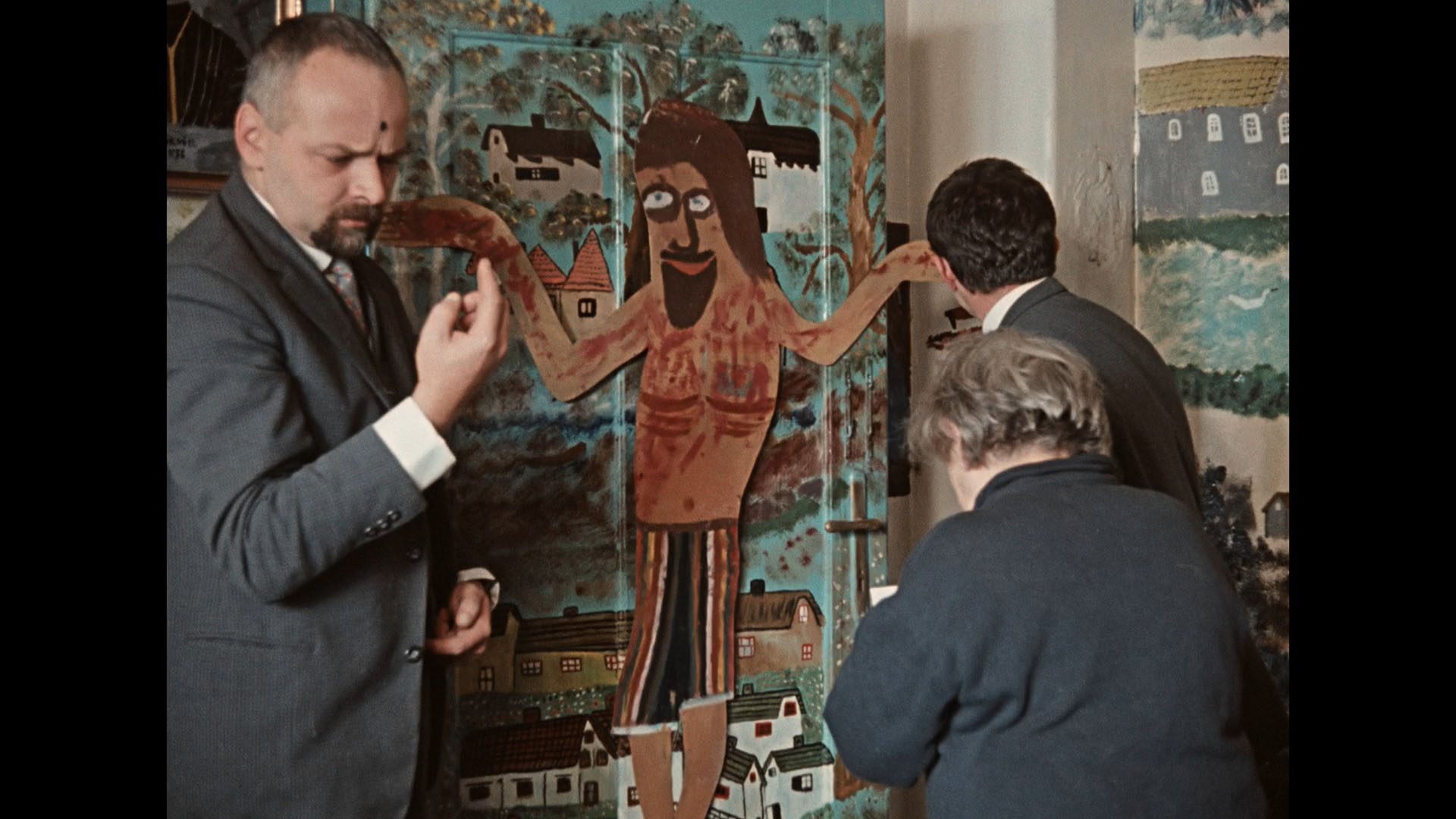 Jan Němec (who delivered The Party and the Guests just after this in '66) chimes in next with "The Imposters," in which a pair of nursing home residents compare notes about their illustrious pasts as a crooner and reporter -- but there's a bit of a twist. "The House of Joy" by Evald Schorm (Return of the Prodigal Son) concerns a quirky artist and some buttoned-up insurance salesmen who pay him a call and get more than they bargained for. This would play really well with early Roman Polanski; it's filled with free association and bizarre, surrealistic touches, including a hilarious bit involving the main character's handiwork on a public highway.