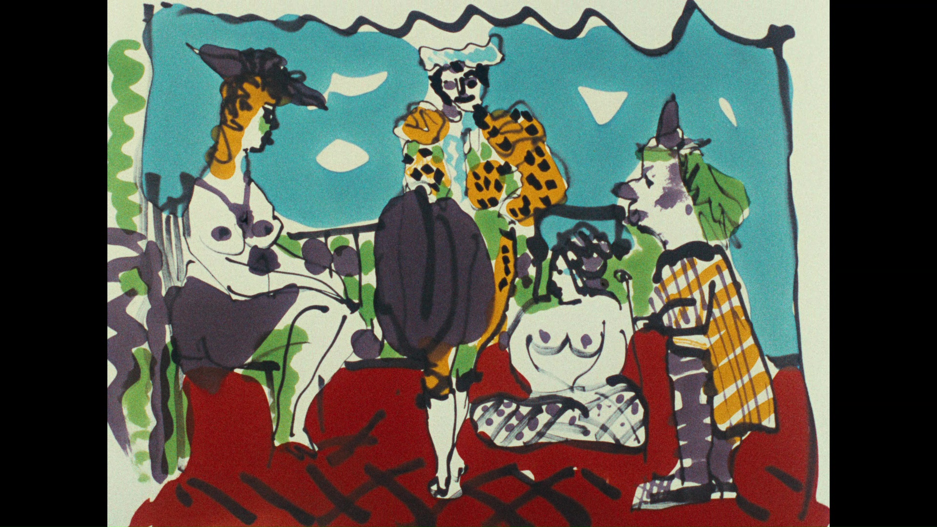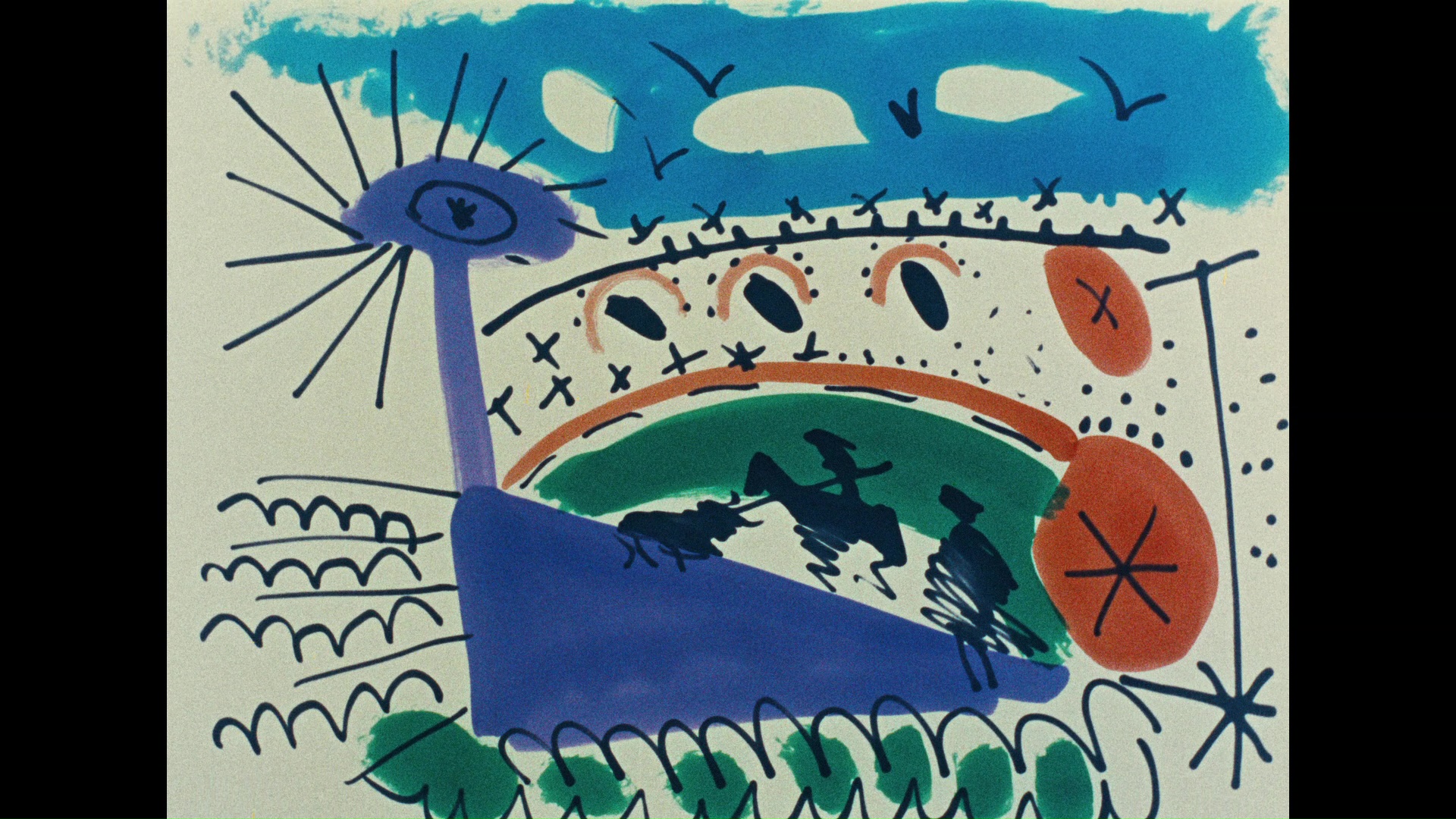 some of the painting shots. La Garoupe (9m30s), a fascinating little 1937 home movie by fellow legendary artist Man Ray, features some early color photography of Picasso and friends savoring food, the ocean, and cigarettes galore in Antibes. "Picasso My Father" (25m30s) is the featurette from the Gaumont release with Picasso's daughter, Maya, chatting in depth about growing up around such artists as Clouzot, Yves Montand, and Simone Signoret, providing a snapshot of how this film grew out of a rich artistic community across Europe. Of course, the best material here concerns her father at work on this film, even if he didn't think of it as such; the warm camaraderie seen in the main feature was quite real. Also ported over from the Gaumont release is a brief restoration demonstration (1m59s) showing how the ravages of time were omitted from the film's negative. The reversible sleeve features a new design by maarko phntm, while the first pressing also includes a booklet with a new essay by author and illustrator John Coulthart.Reviewed on January 22, 2018.