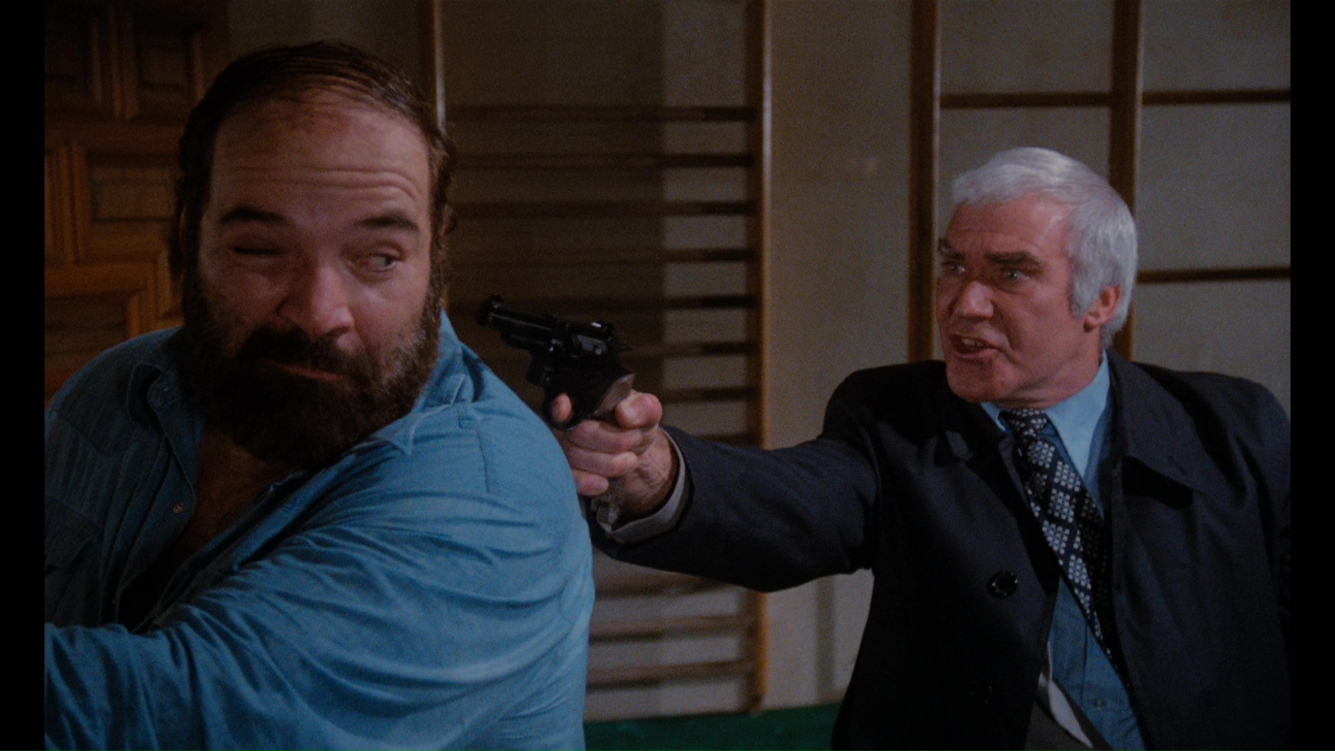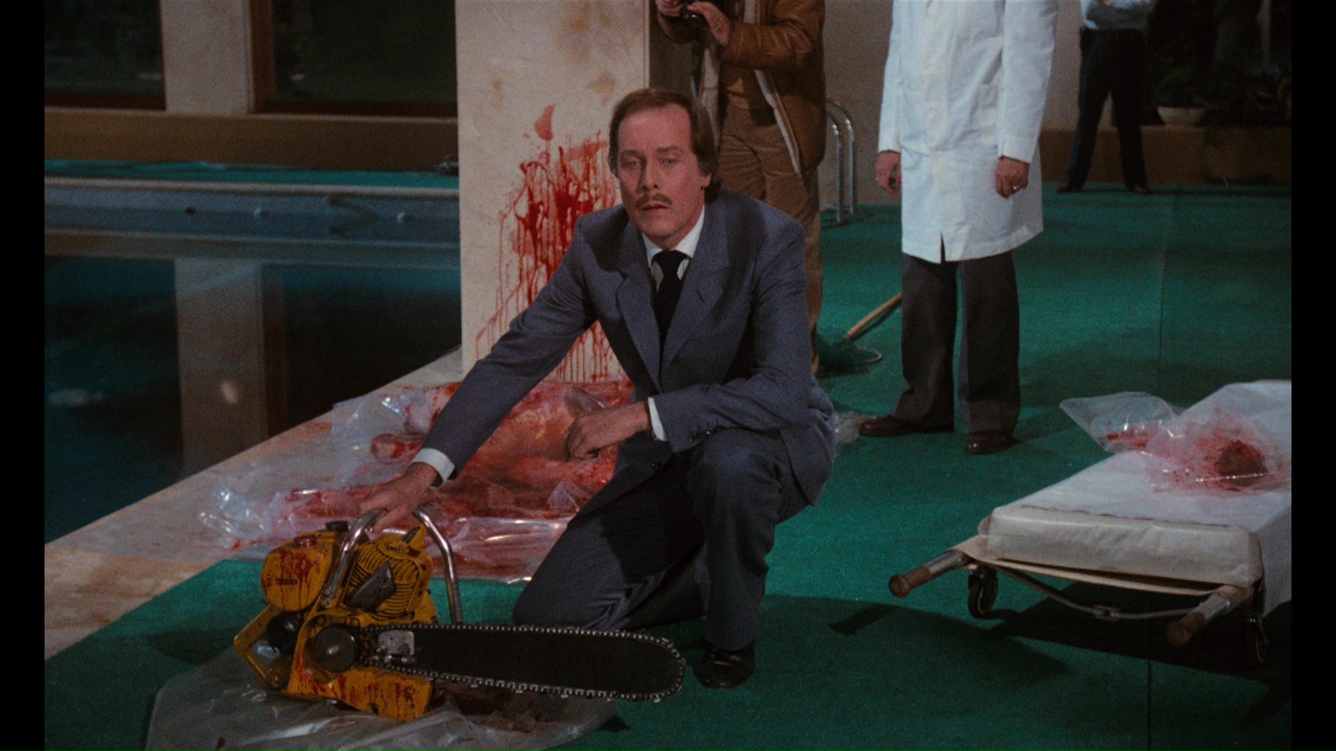 about the giallo influence on Pieces, the hilarious motivations for the killer's activities (triggered with a head-scratching early scene involving a dense roller skater flying to her death in a big pane of glass, thus bringing his psychosis back to the surface) should quickly reveal its true intentions. Plentiful suspects (including a chainsaw wielding groundsman played by Popeye's Bluto himself, Paul Smith!), endless police procedurals, a mysterious killer in black, and often naked women being terrorized in dark settings -- yep, it's all right here. Even the catchy, pulsating library soundtrack for the English-language version liberally douses the film with excerpts of the scores by Stelvio Cipriani and Claudio Maria Cordio for Ring of Darkness and Absurd. The best way to enjoy Pieces is probably as an unintentional comedy, partially thanks to Sera's doe-eyed and wholly unsympathetic performance, while the endless parade of female nudity is too ludicrous to take seriously. Sleaze fans should also watch for Franco regular Jack Taylor as a know it all professor, who has some of the best lines when he stumbles onto one gory crime scene.
