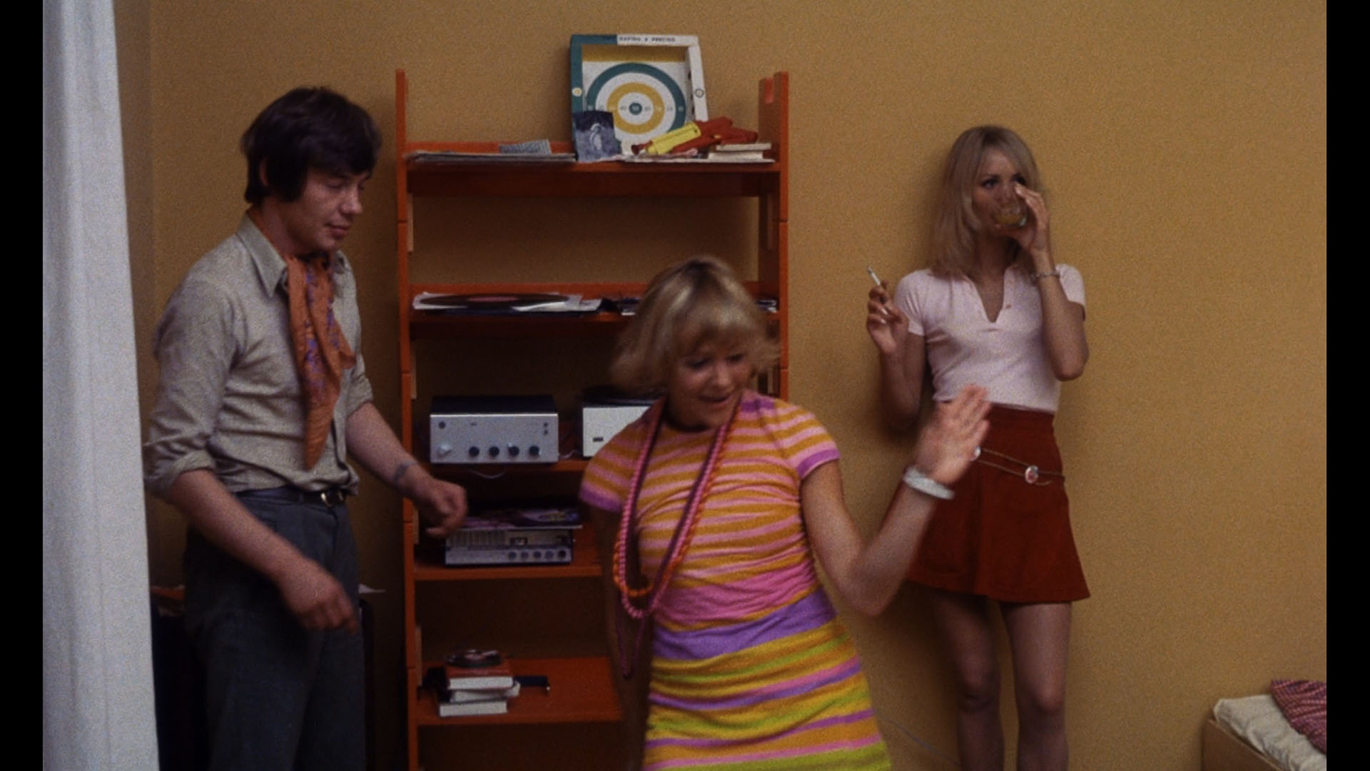 Never given an official English-subtitled release of any kind at the time, Red Sun hit German DVD a couple of times but should find a much larger audience with its 2023 Blu-ray release from Radiance Films simultaneously in the U.S. and U.K. (limited to 2,000 copies in each territory). The HD transfer supervised by Thome looks excellent with the frequent vivid primary colors (especially red and gold) making a strong visual impression; the film comes up with a unique look for all of its substantial locations (the apartment, nightclub, and outdoors), and this version shows it off very well. The LPCM 2.0 German mono track is also in fine shape (the classic music fares especially well) and comes with optional English subtitles.